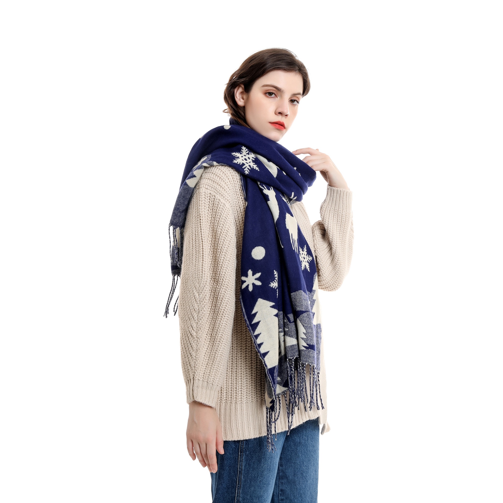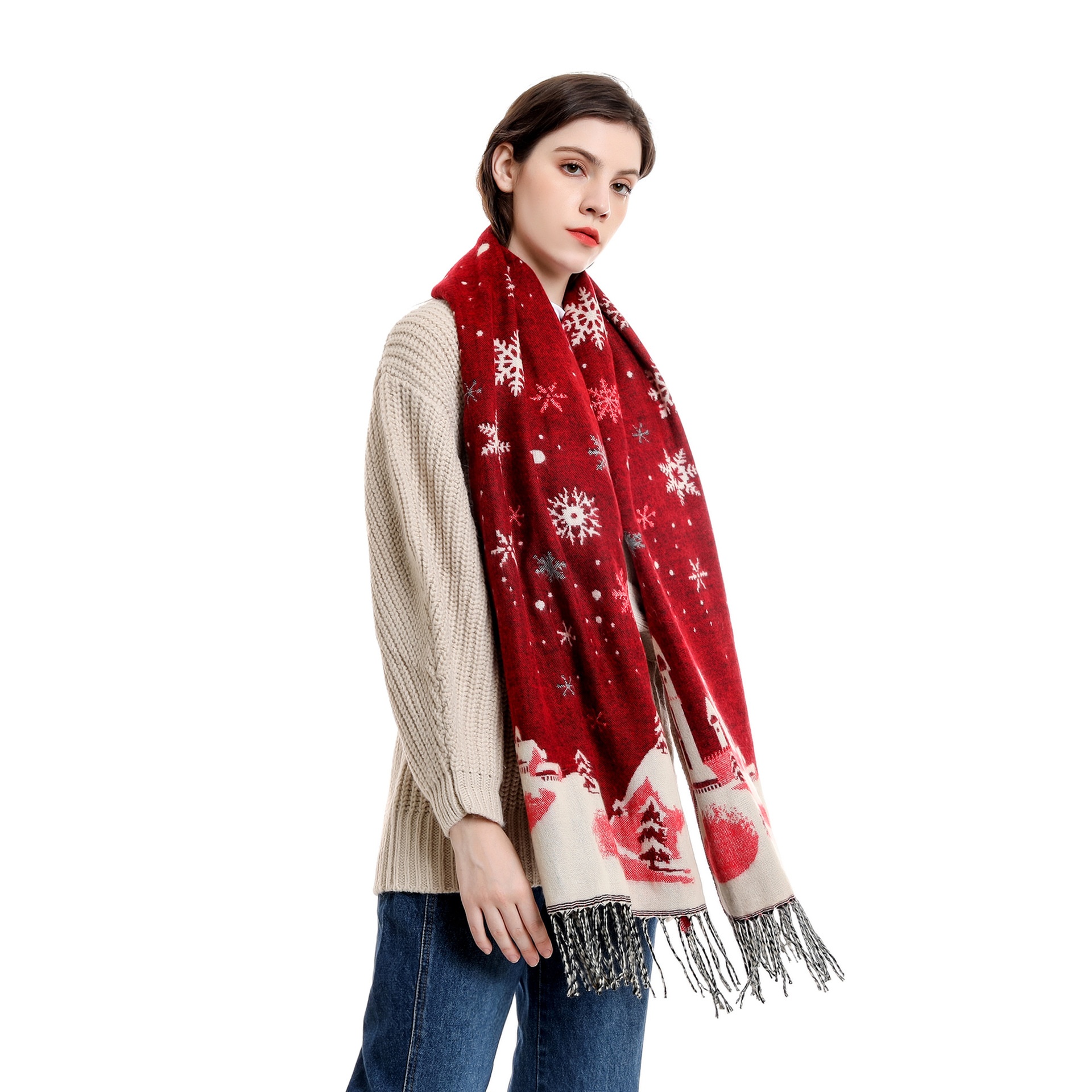 Christmas Warm Scarf Women's Korean Style Fashion Tassel Autumn And Winter Red Scarf Printed Long Snowflake Pattern Neck Scarf