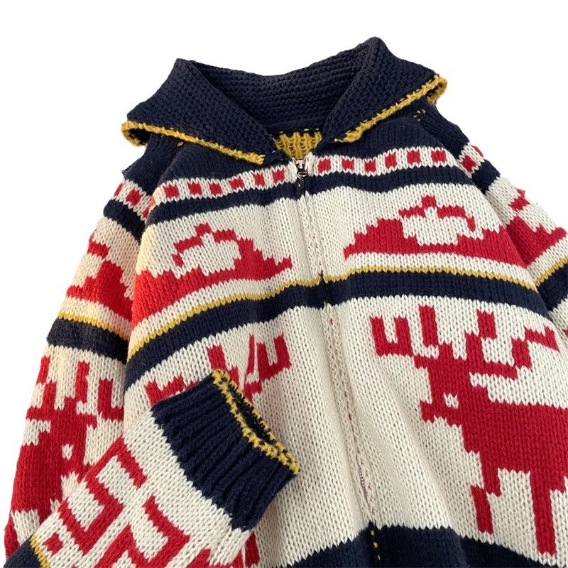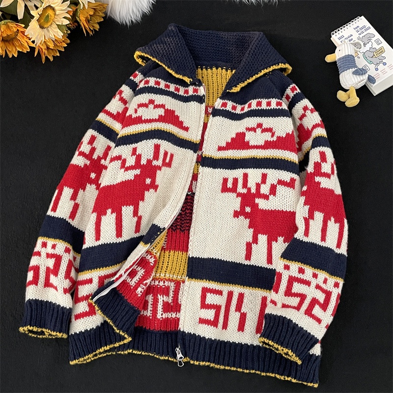 Christmas Reindeer Print Knit Cardigan:Heavy Craft Lapel Sweater Jacket