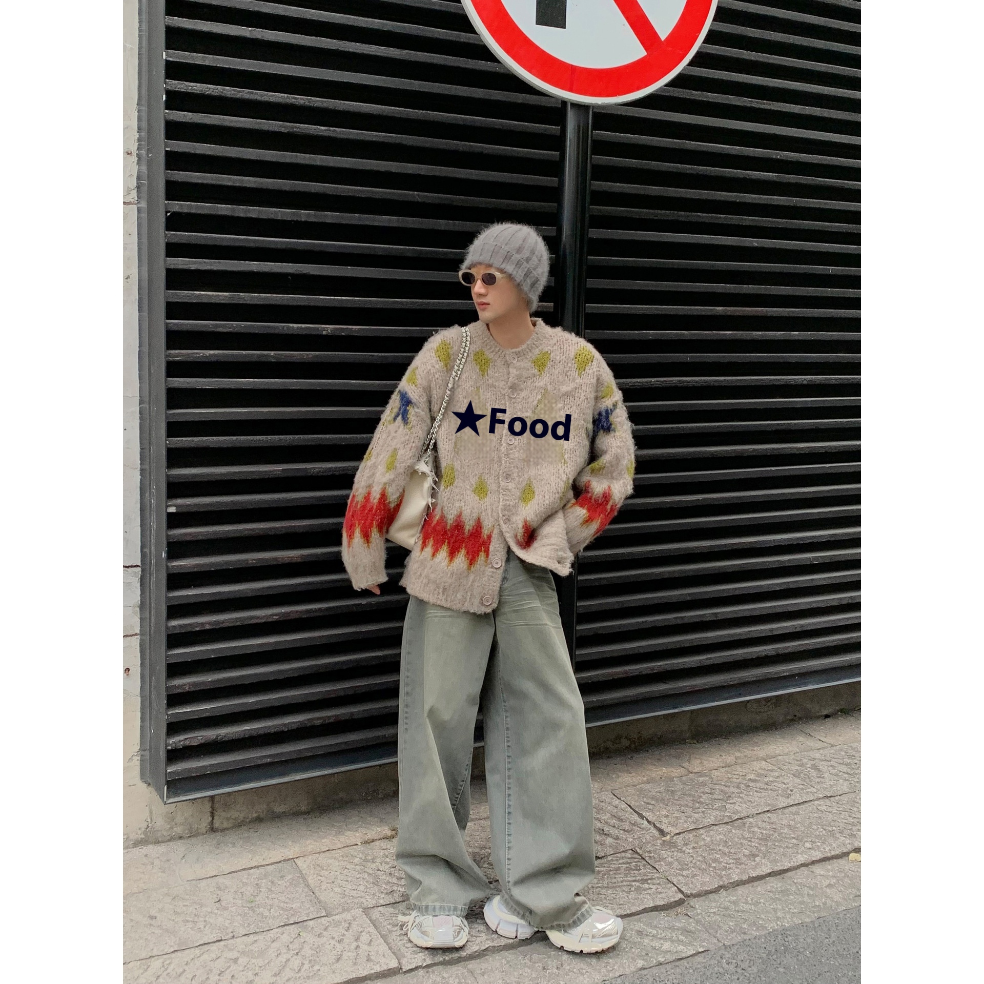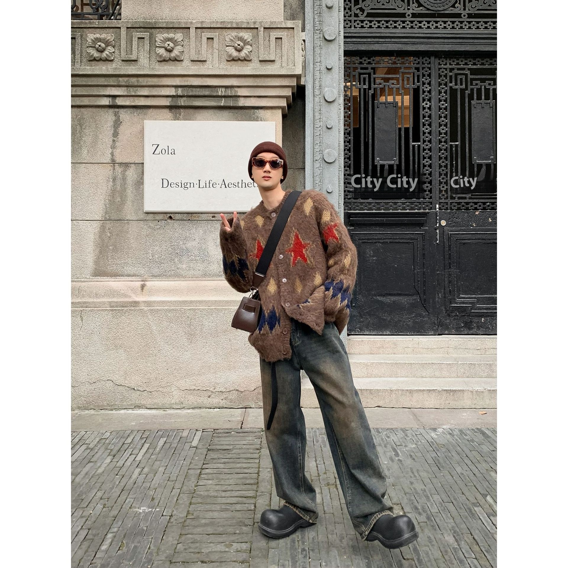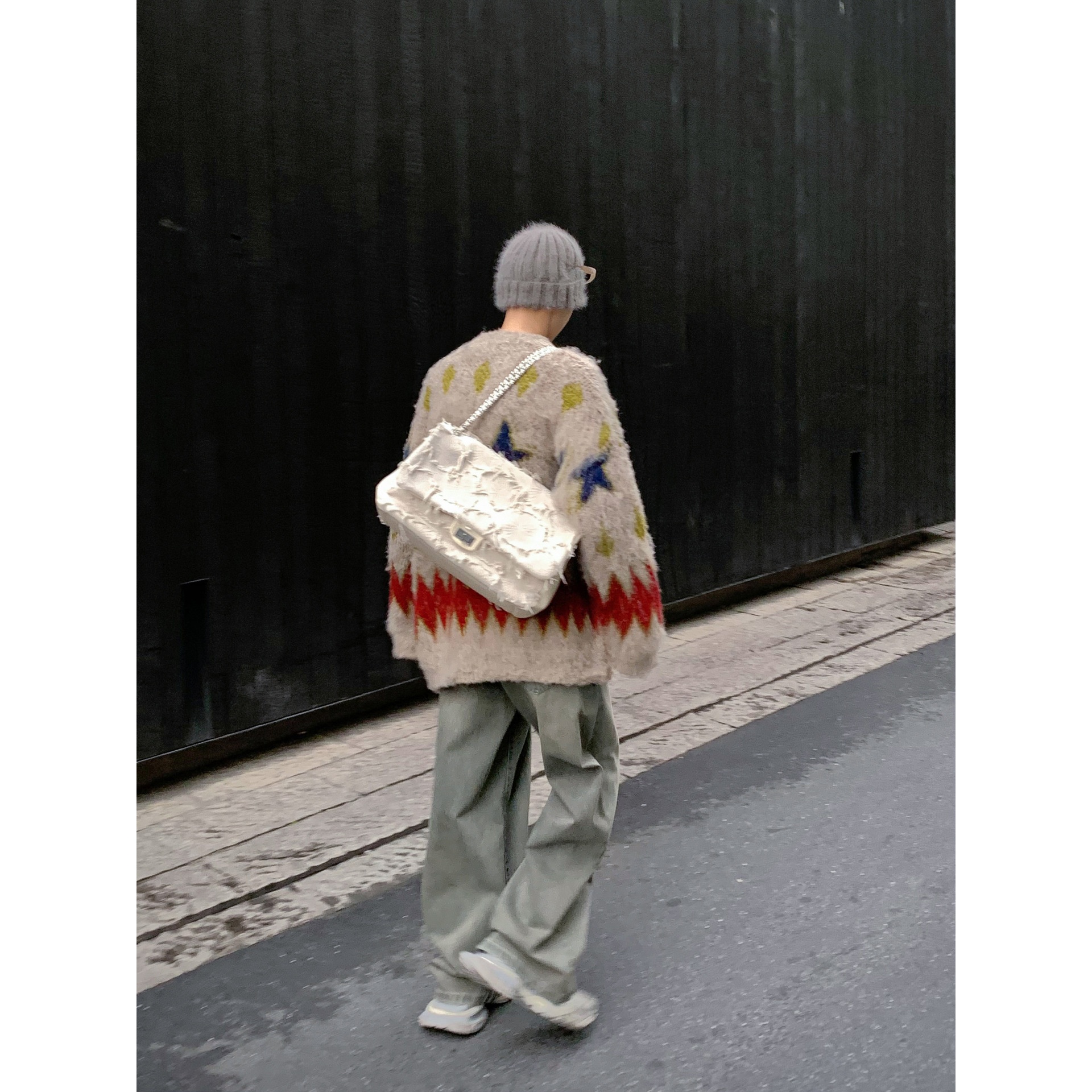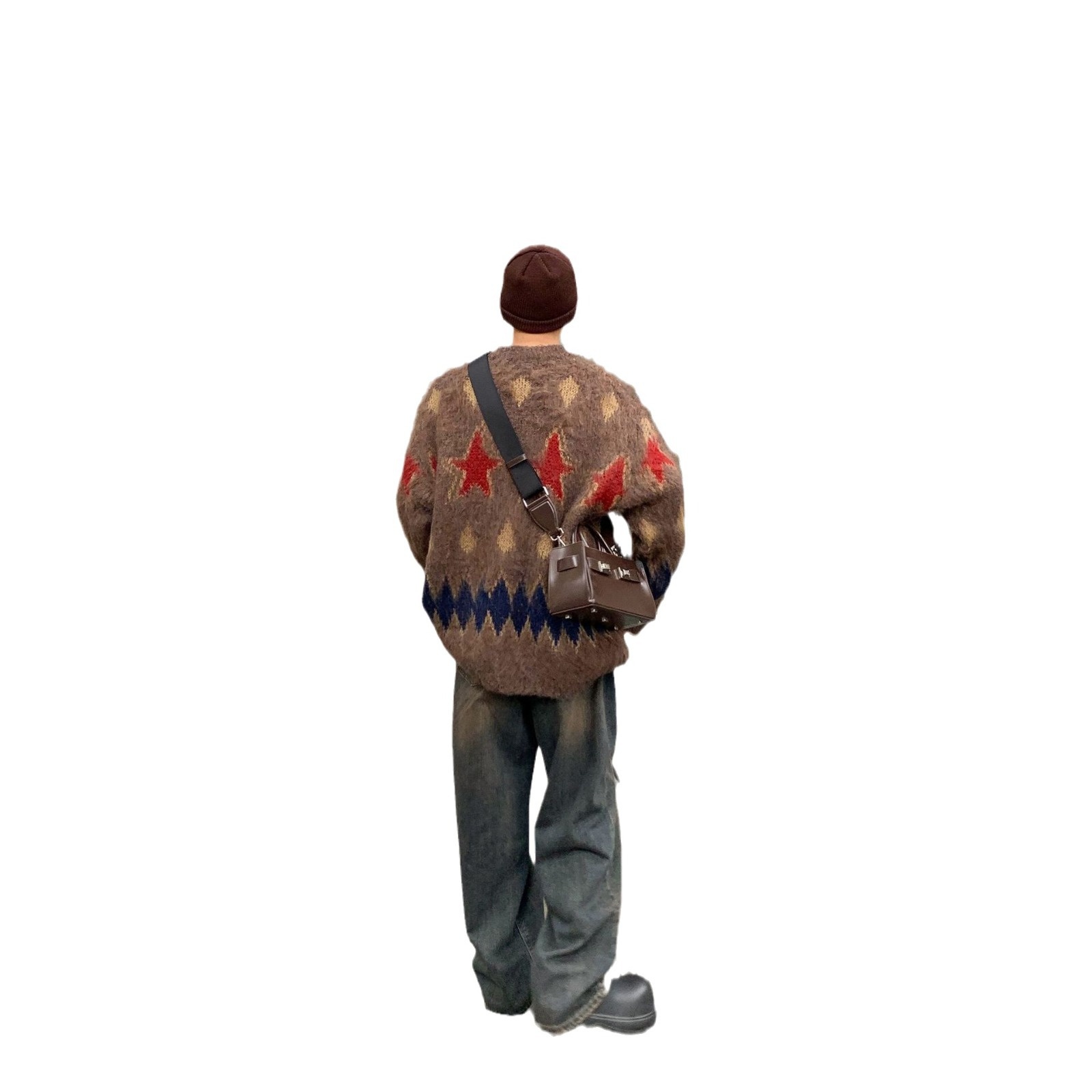 Christmas Atmosphere Sweater:Loose-Fit Vintage Star And Diamond Pattern Knit Cardigan In Relaxed Style
