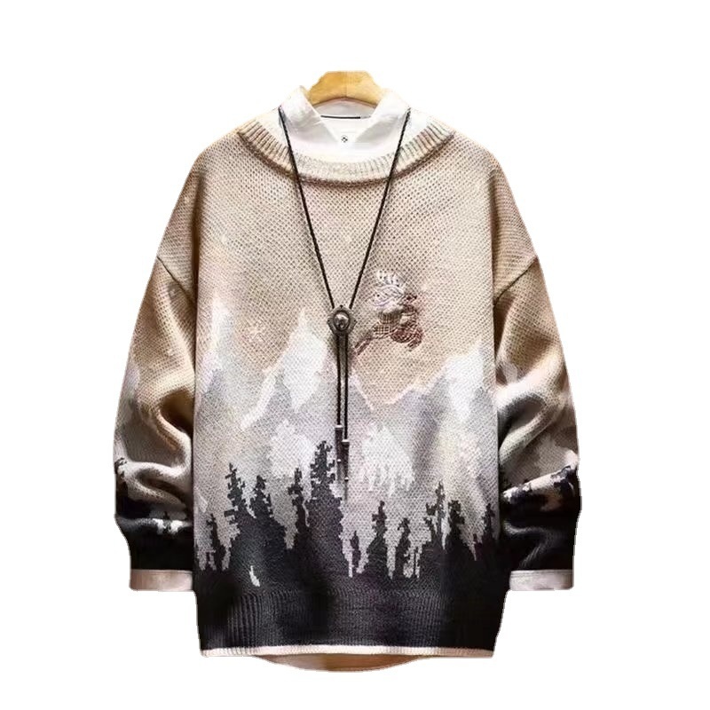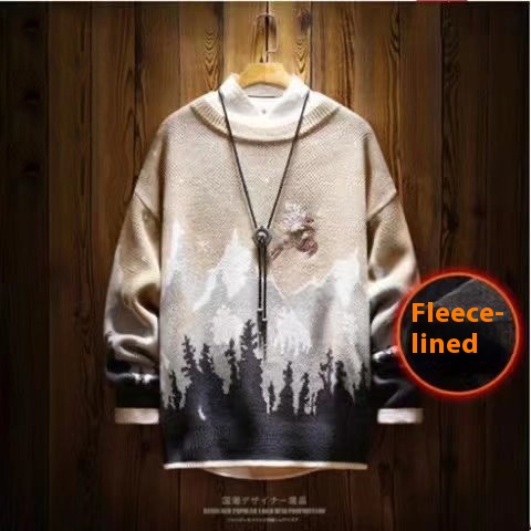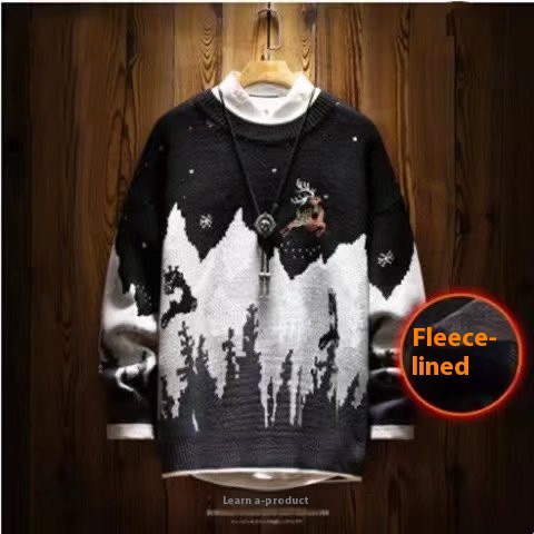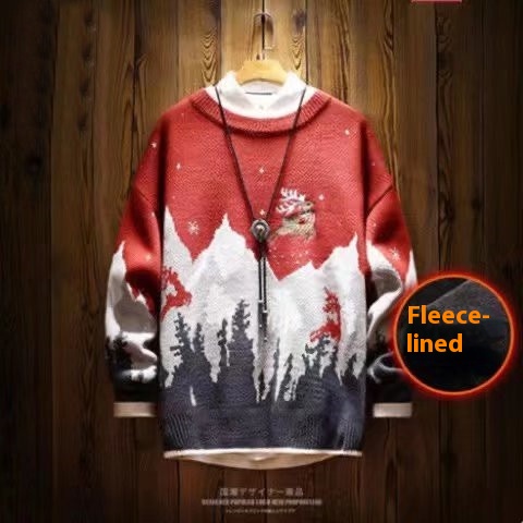 Snow Mountain Reindeer Embroidered Christmas Sweater:Japanese Vintage Fleece-Lined Thickened Knitwear