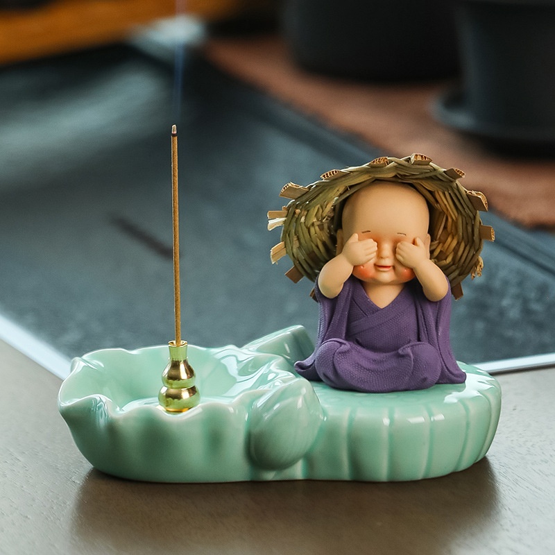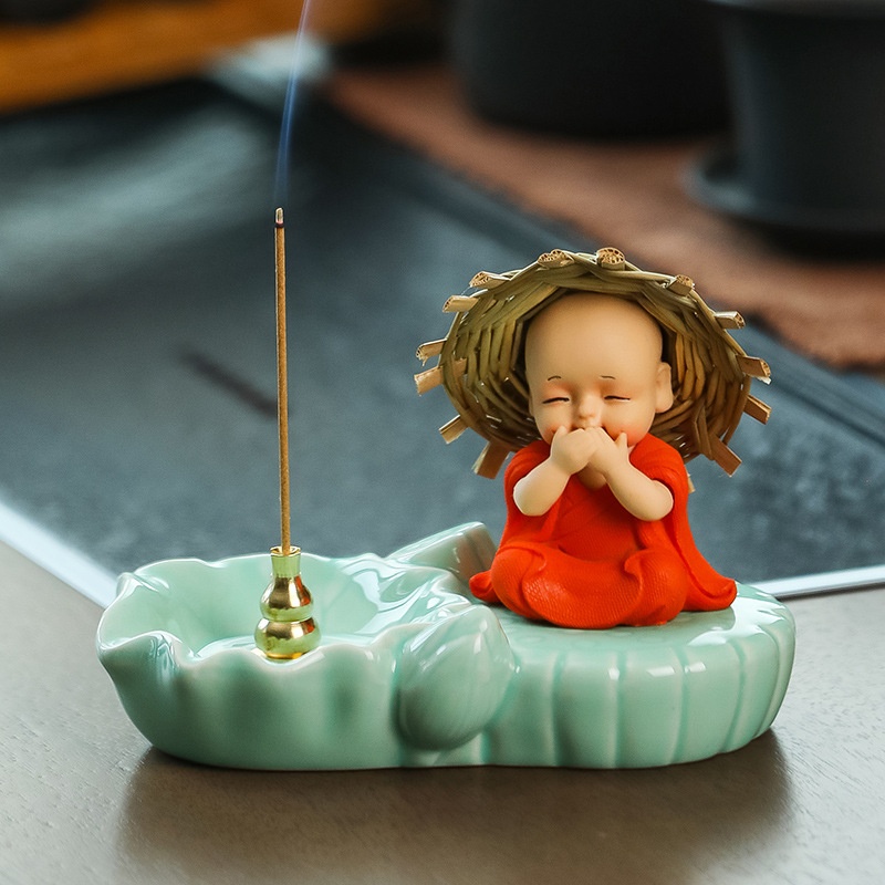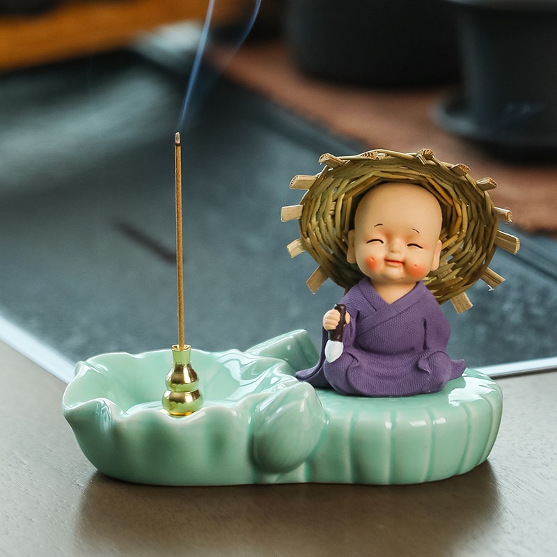 Cute Little Monk In AStraw Hat,Incense Holder,Ceramic Household Offering,Incense Holder,Incense Tray,Aromatherapy Stove,Home Decoration