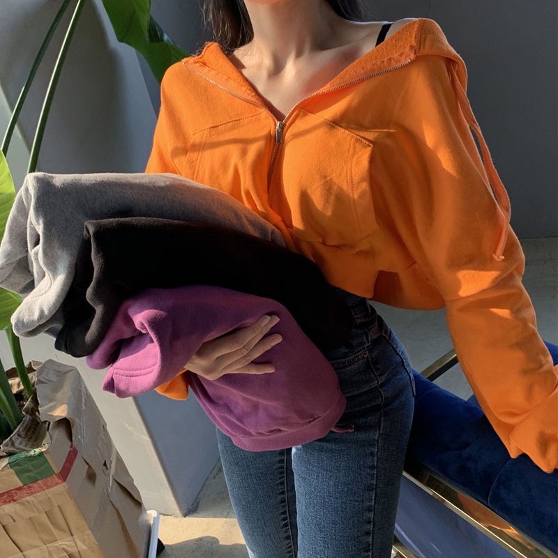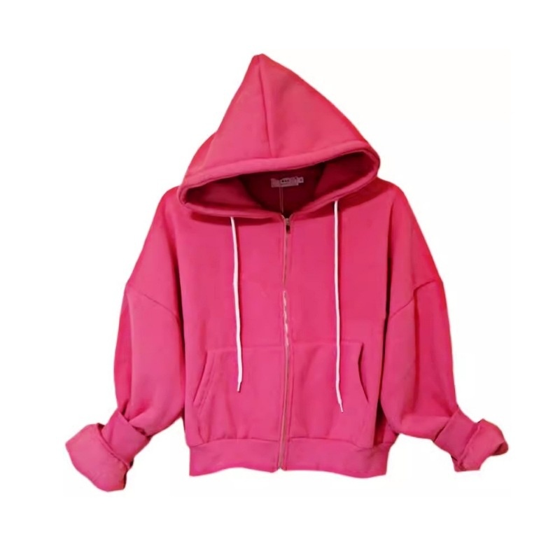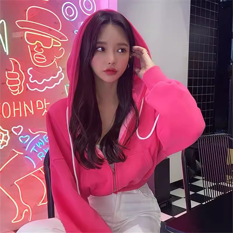Spring And Autumn Style Plus Velvet Solid Color Hooded Sports Short Sweater Fashion Loose Zipper Cardigan Jacket Women's