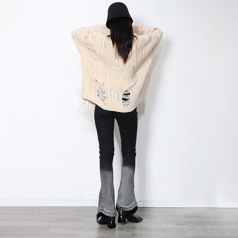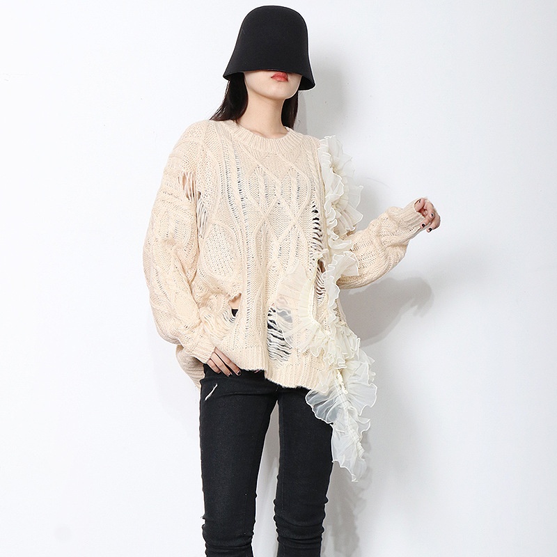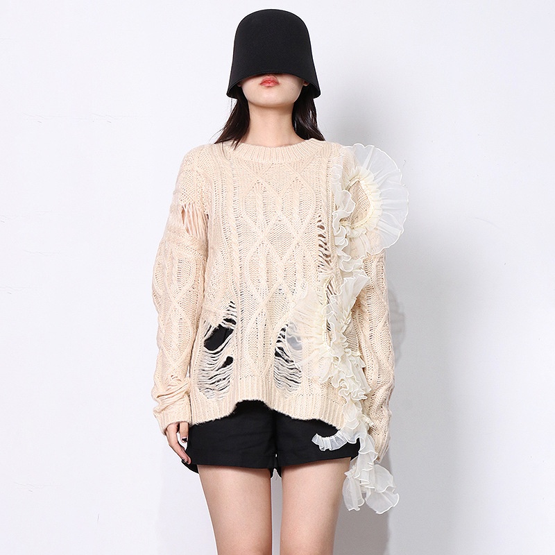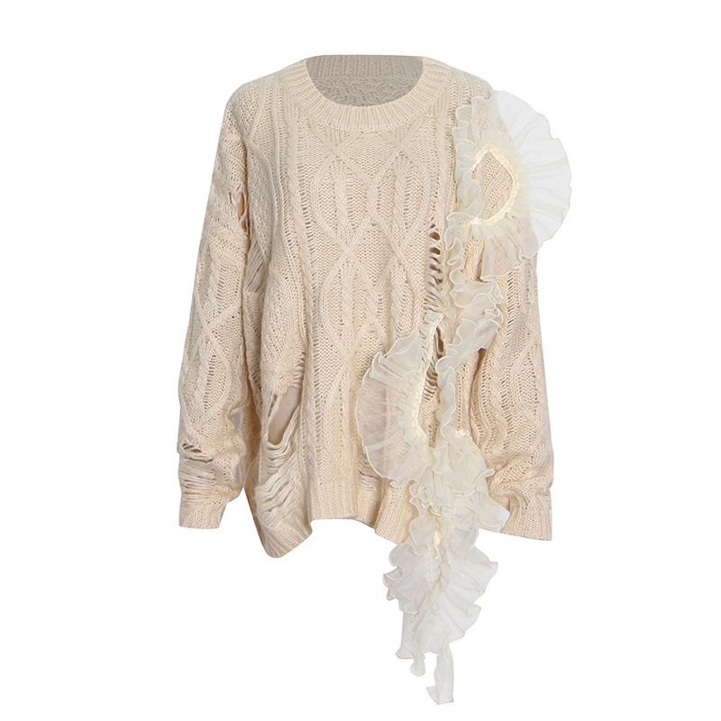 Hollow Design Sense Lace Stitching Round Neck Pullover Sweater Long Sleeve Sweater Clothing