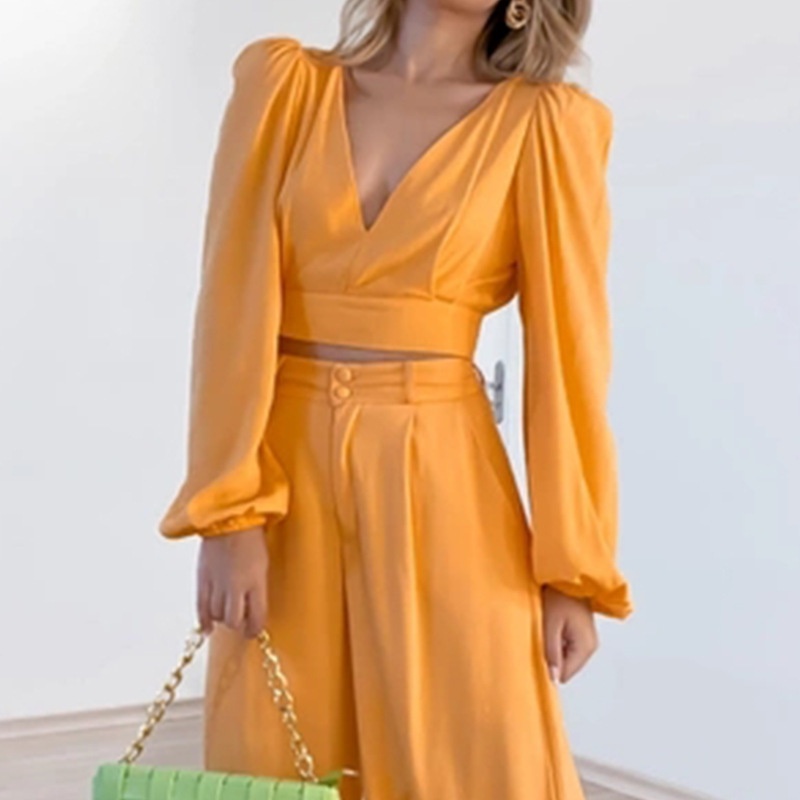 V-neck Long-sleeved Shirt High Waist Wide-leg Trousers Large Size Fashion Casual Suit
