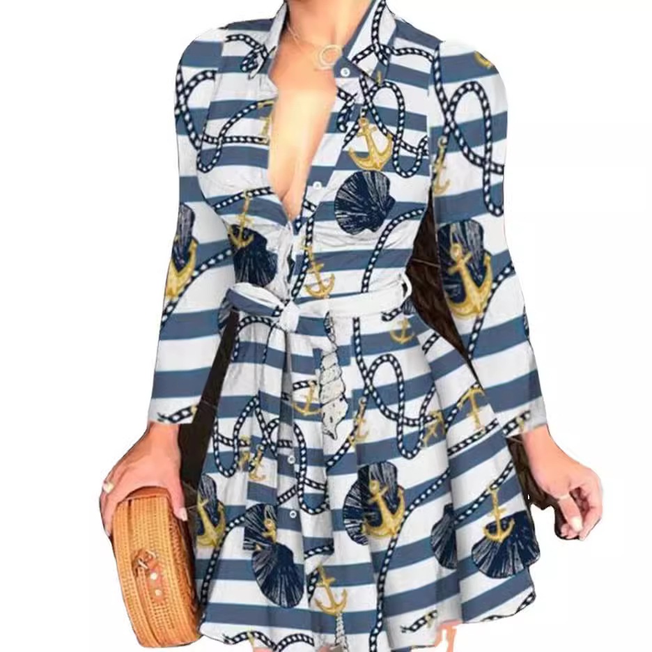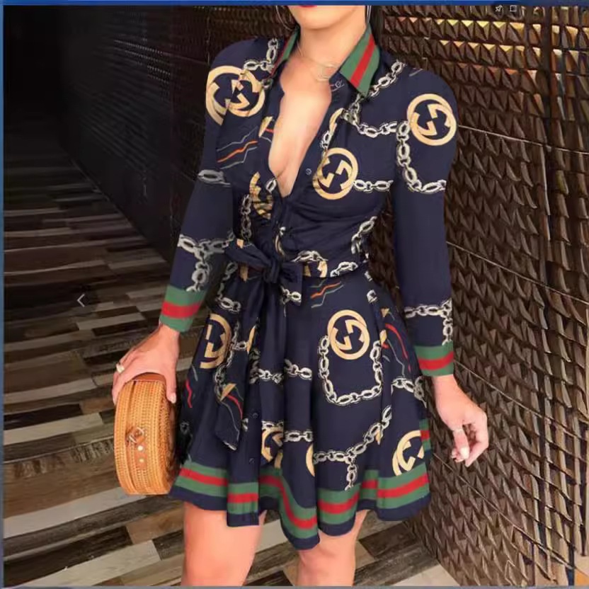 Long Sleeve Skirt V-neck Strap Fashion Sexy Printed Dress