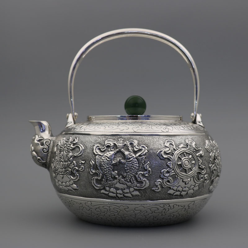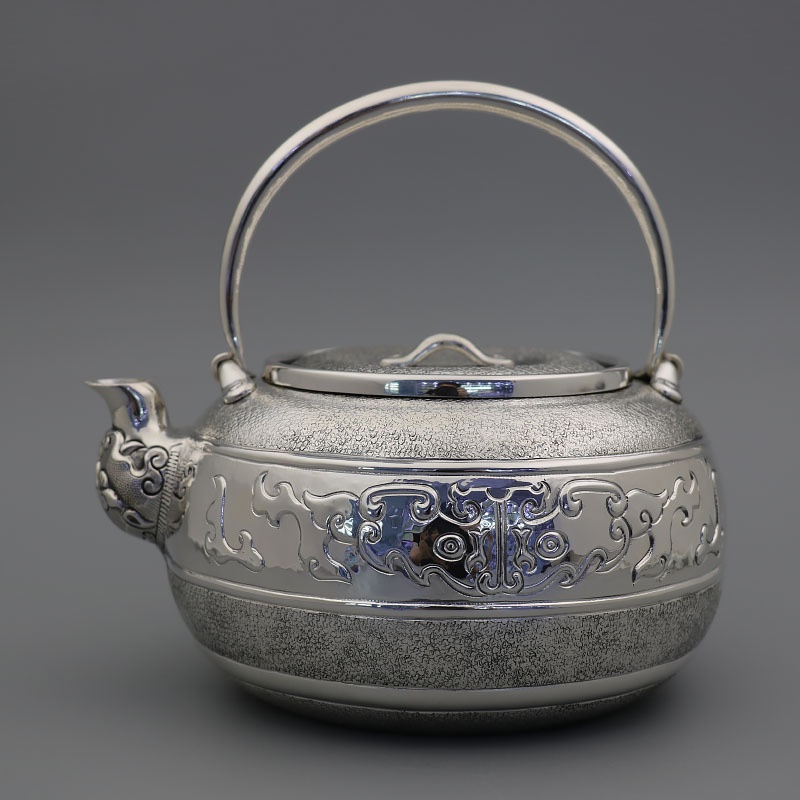 Pure Silver Kettle999 Sterling Silver Vintage Silver Kettle Taotie Ice Crack Eight Auspicious Home Tea Set Silver Teapot