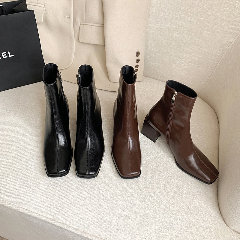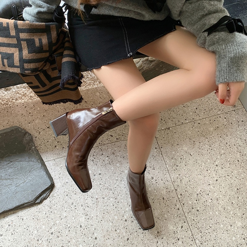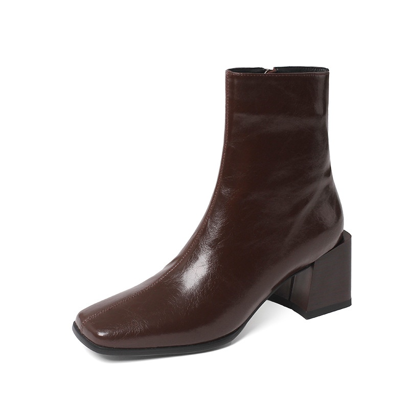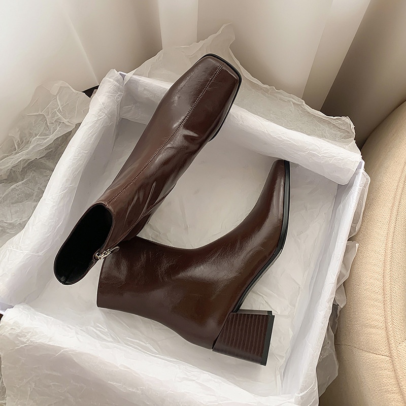 Super Soft And Comfortable!Autumn And Winter Thick Heel Ankle Boots High Heel Square Toe Leather Martin Boots Women's Brown Single Boots