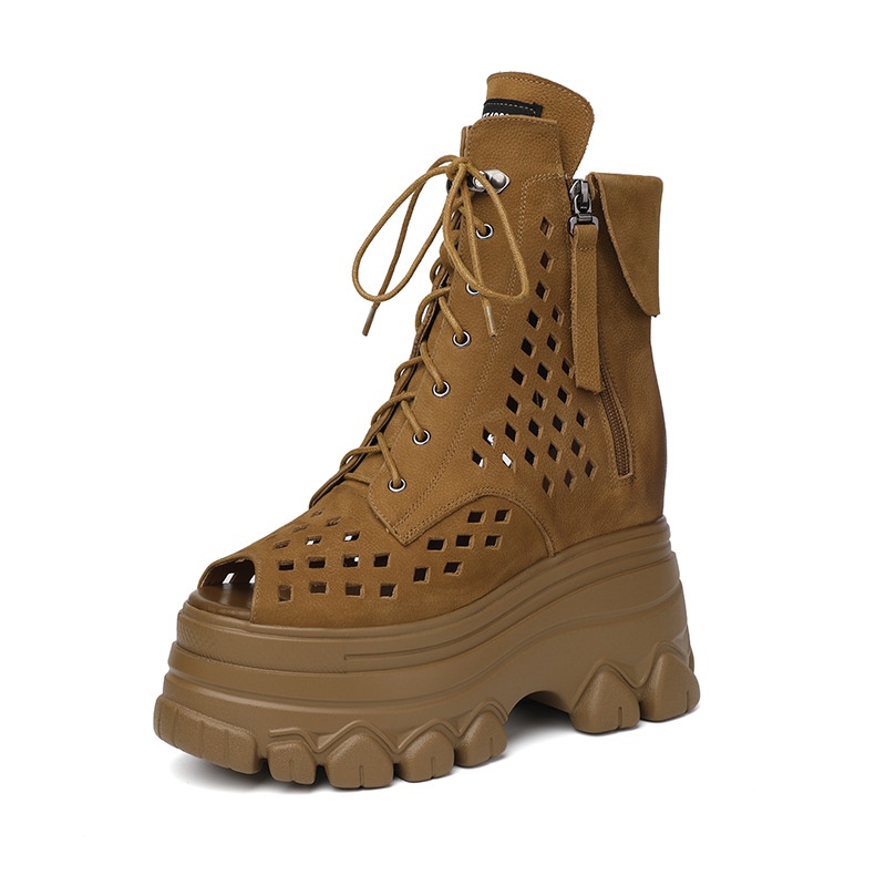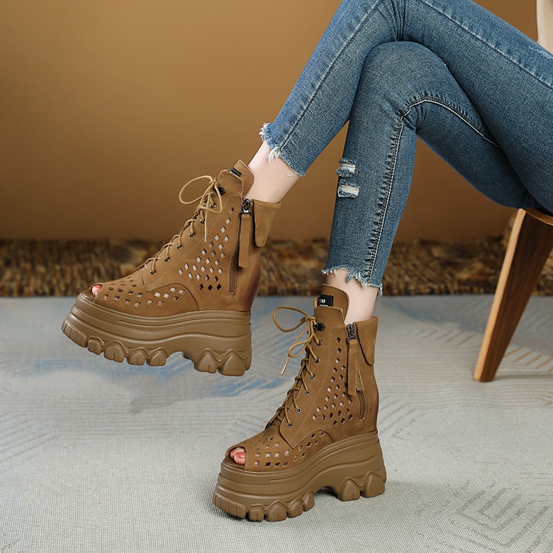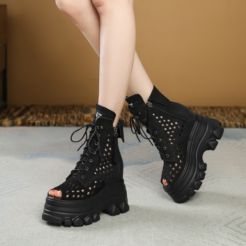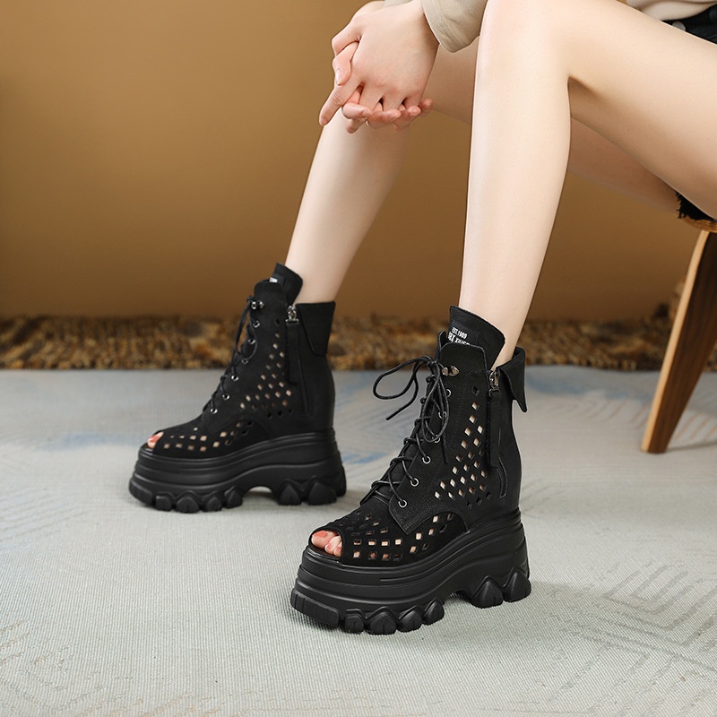 12cm Inner Height Increasing Leather Hollow High-top Roman Sandals Women's Fish-mouth Summer Platform Thick-soled Sandals Retro Martin Boots