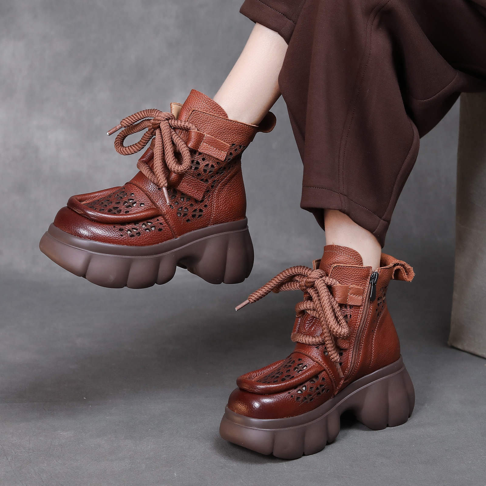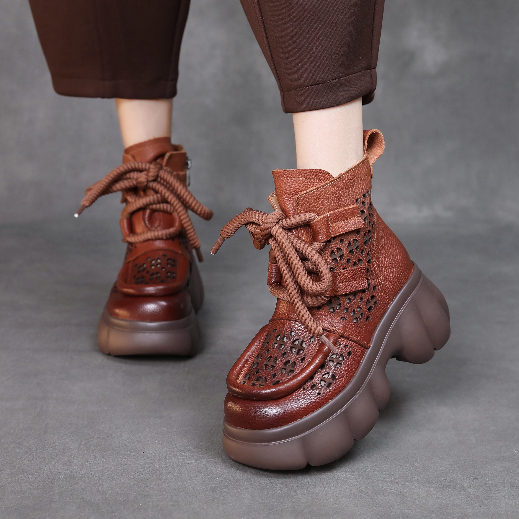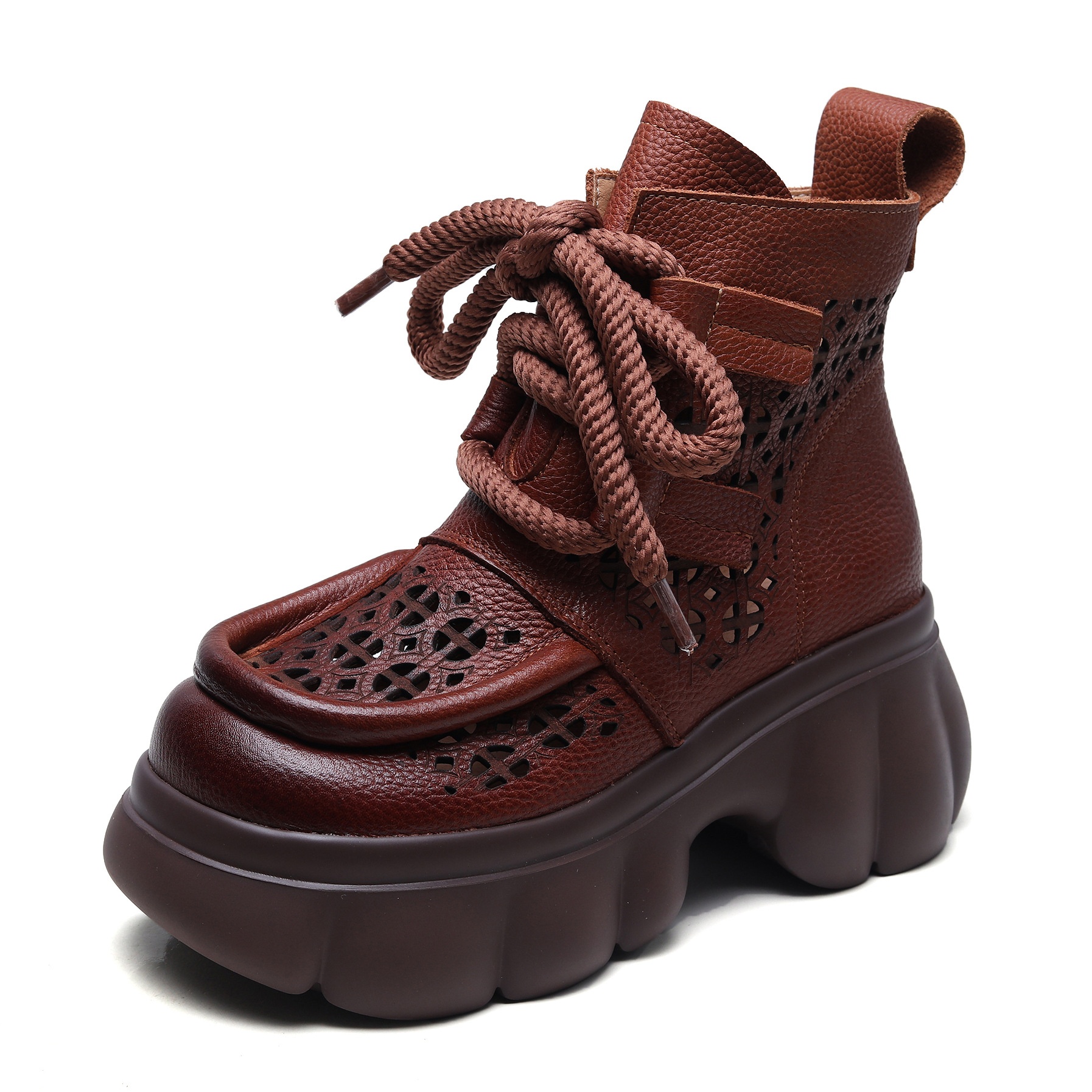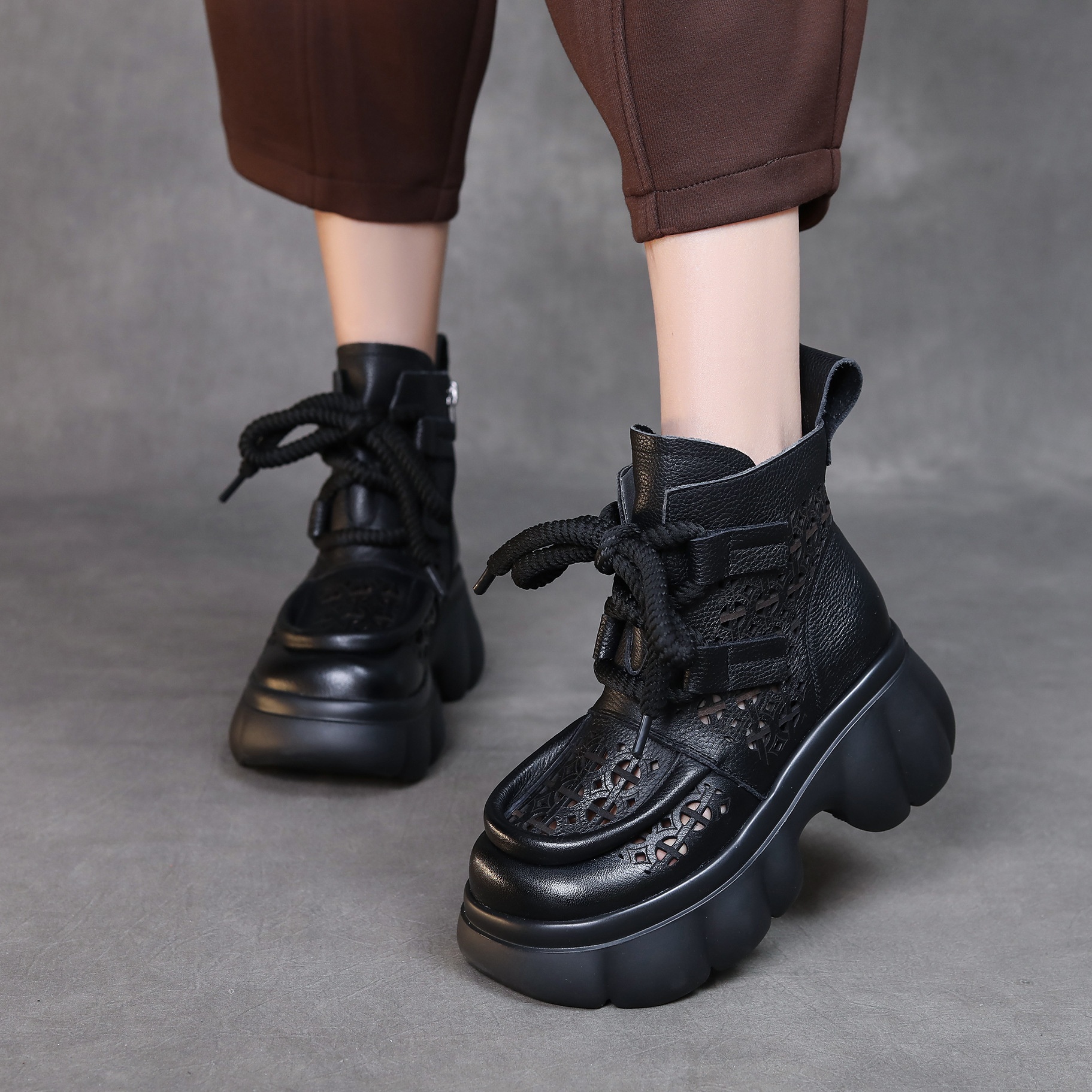 Summer Hollow Roman Shoes For Women Thick-soled Lace-up Sandals Genuine Leather Hole Shoes Short Boots High-top Platform Martin Boots