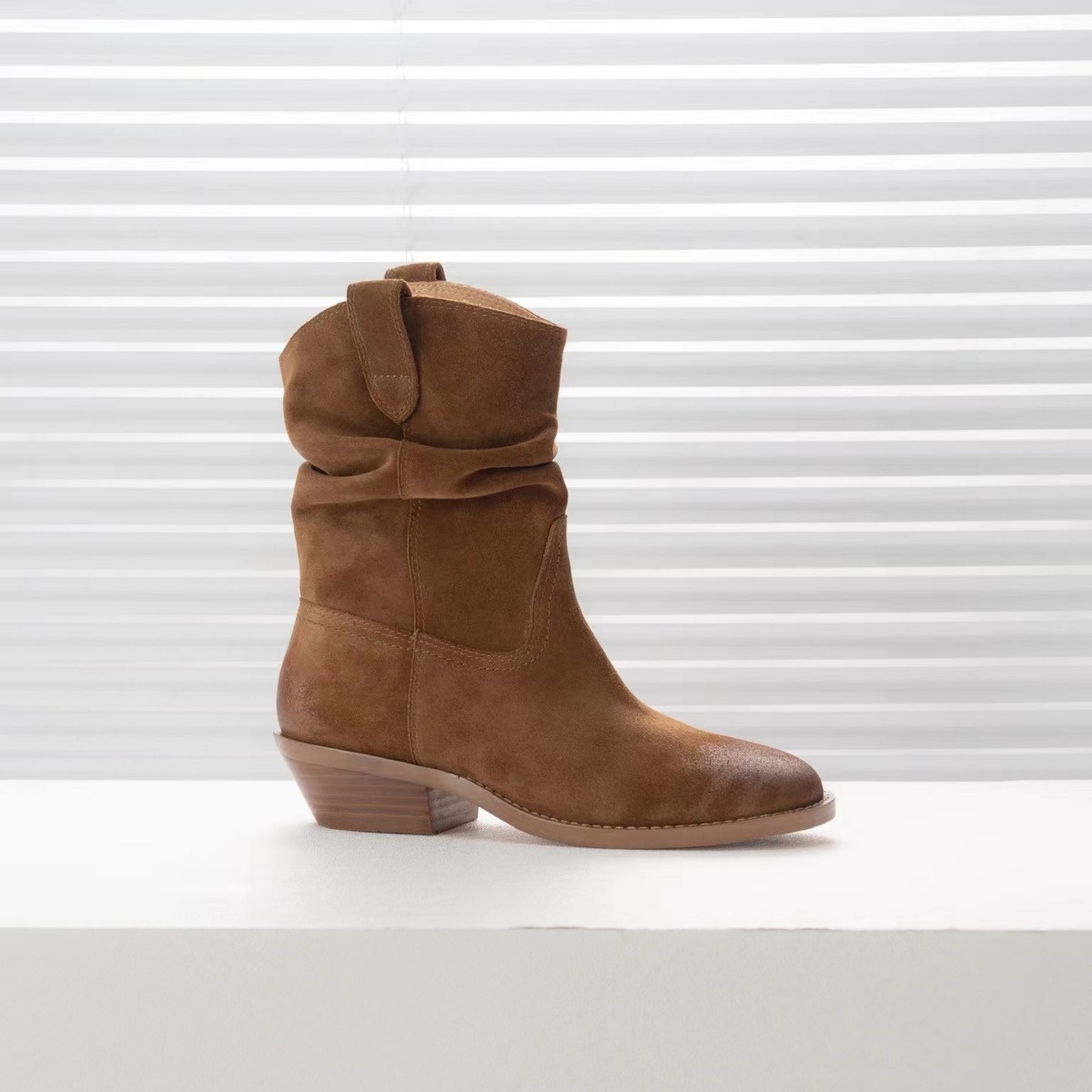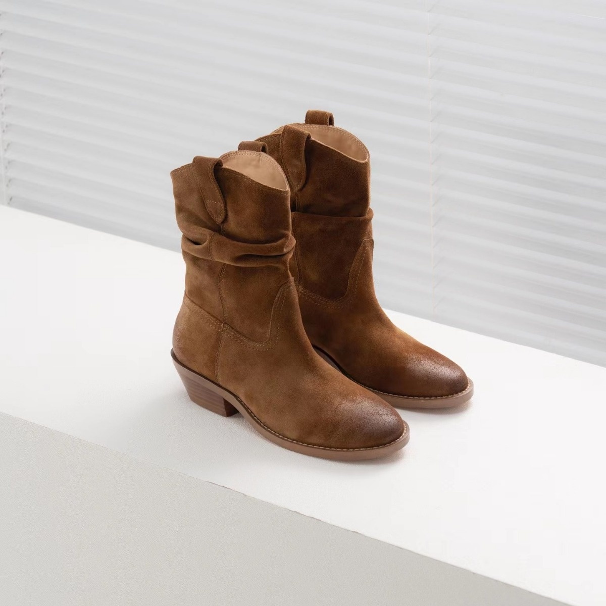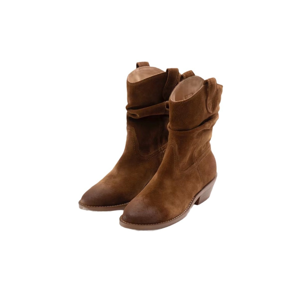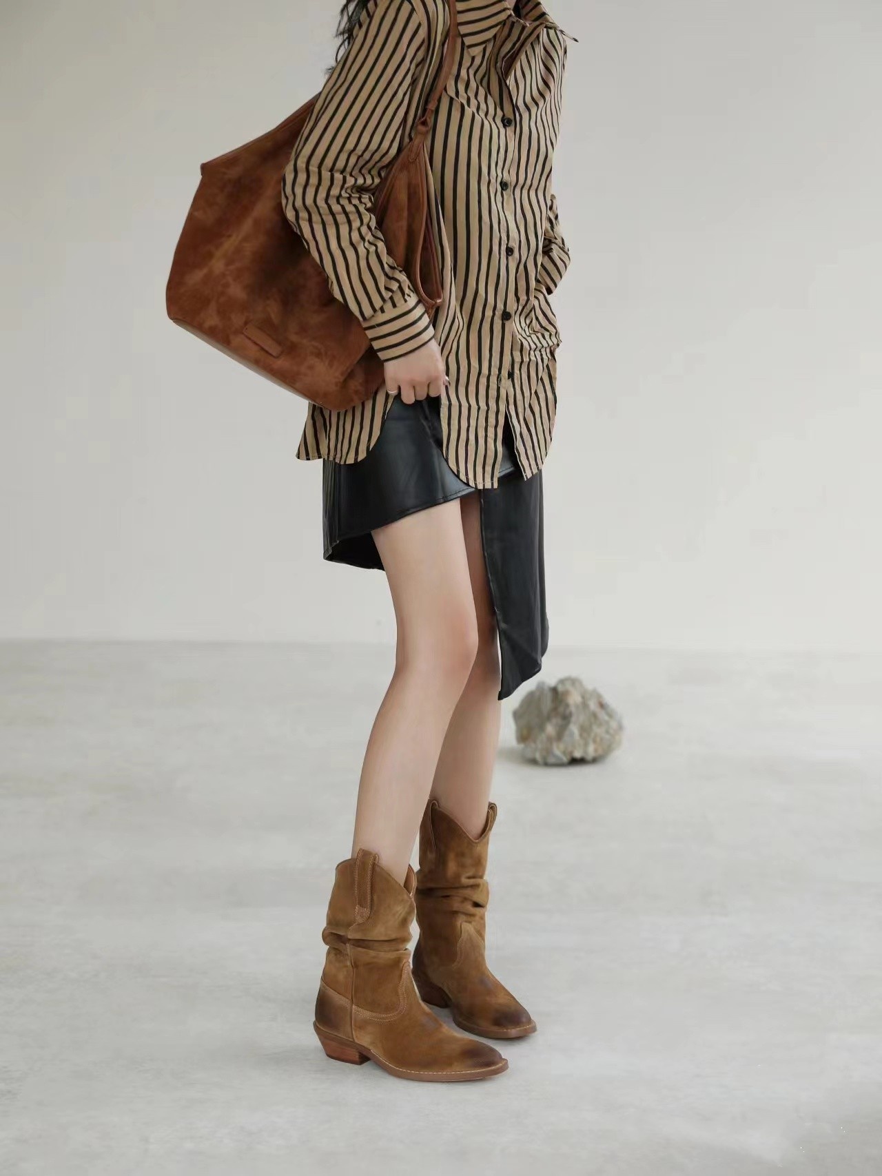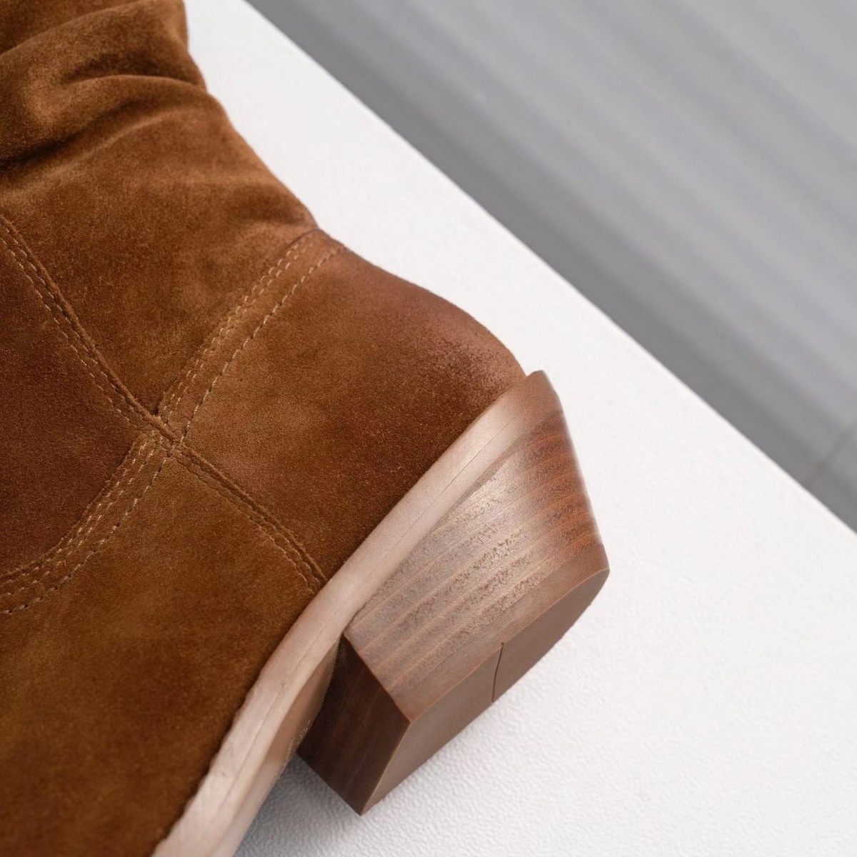 Autumn And Winter Style Pile Boots French Retro Color Rubbing Cow Suede Knight Boots Round Head Thick Heel Brown Mid-calf Boots