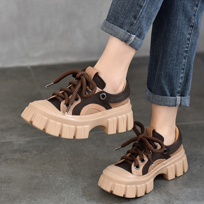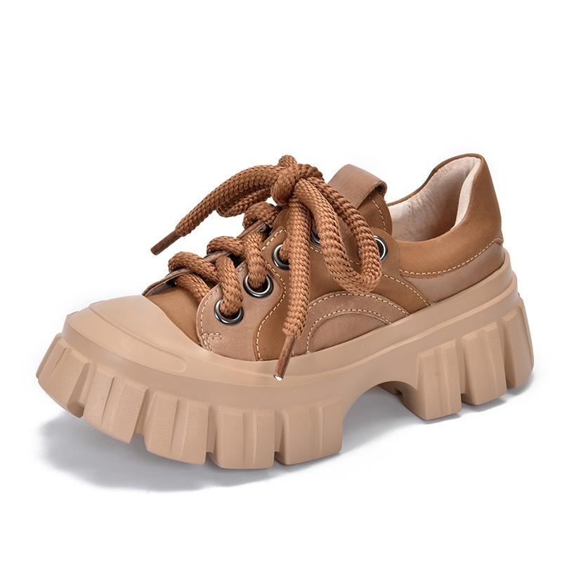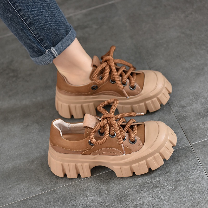Waterproof Platform High Heel Shoes For Women Spring Retro Style Lace-up Thick-soled Shoes Genuine Leather Round-toed Casual Shoes For Women