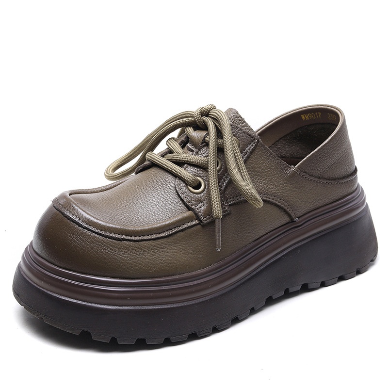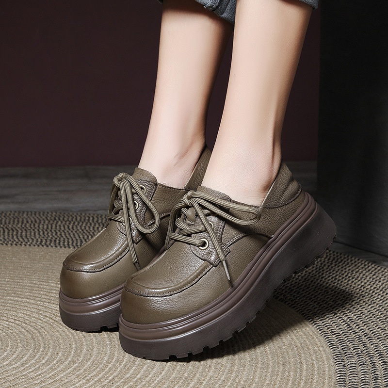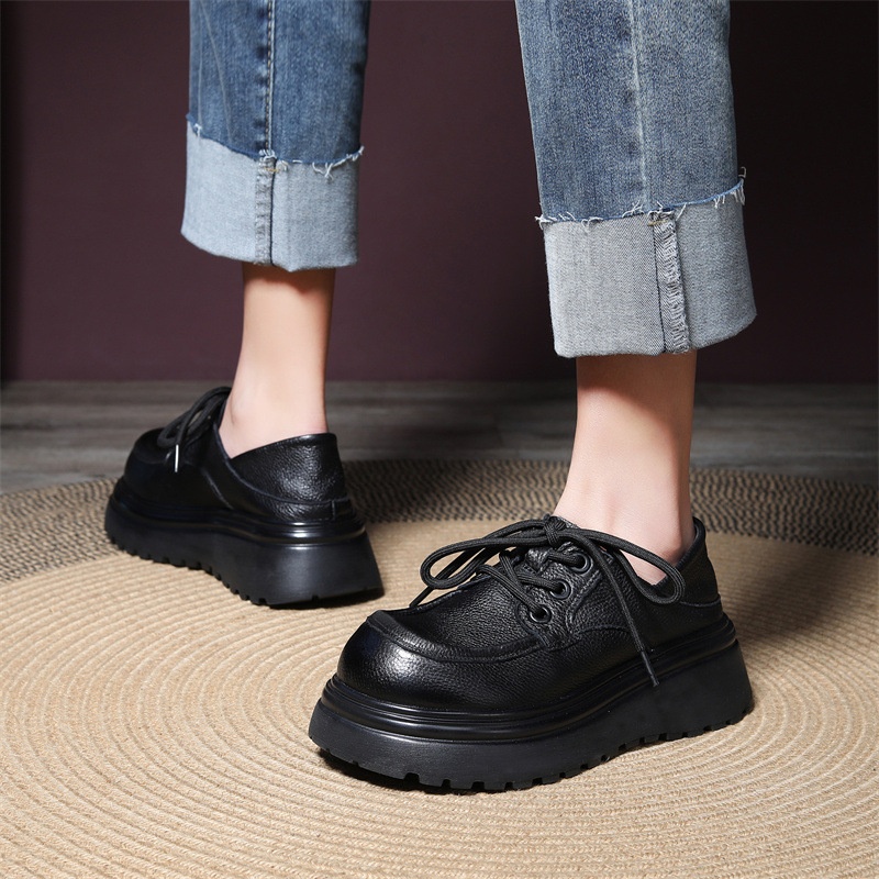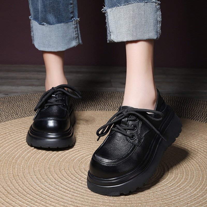 Delphinium Thick-soled Genuine Leather Shoes For Women British Style Spring Round-toed Single Shoes Lace-up Japanese Single Shoes
