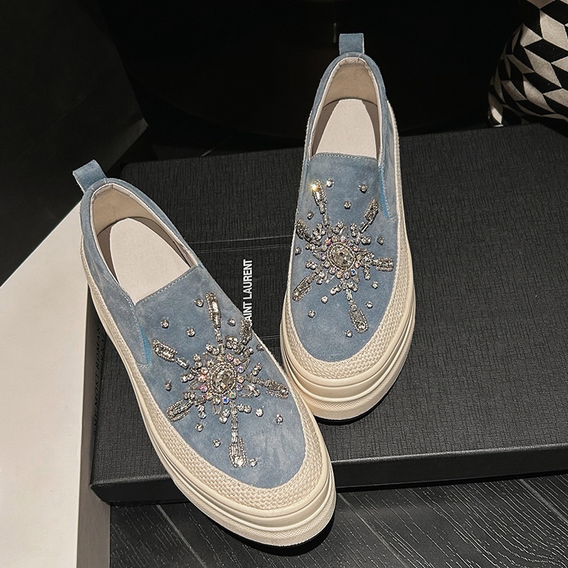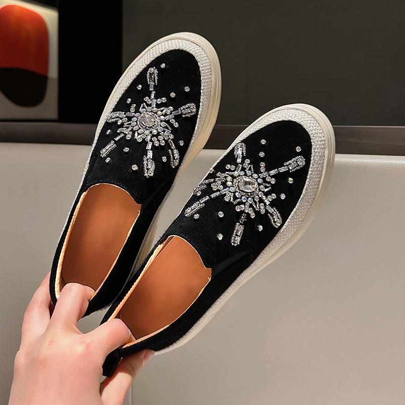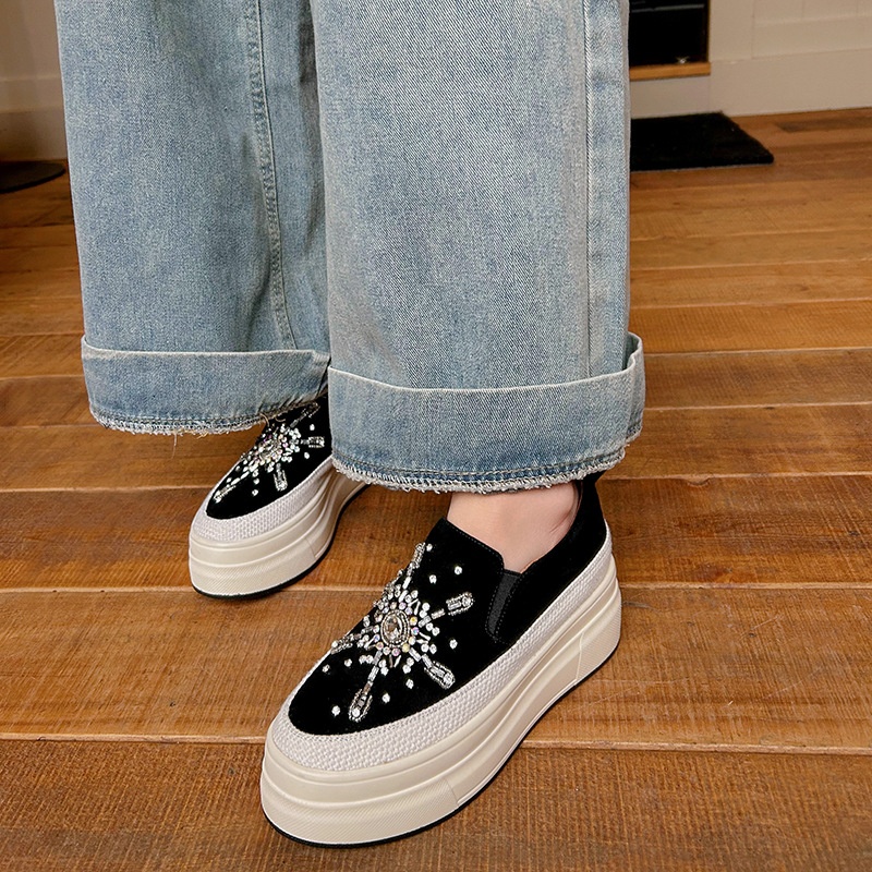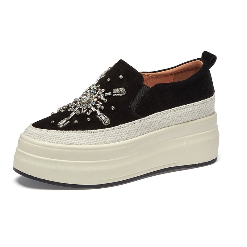 Thick-soled Platform Slip-on Loafers Frosted Sheepskin Casual Shoes Spring And Autumn Rhinestone High-heeled Shoes For Women