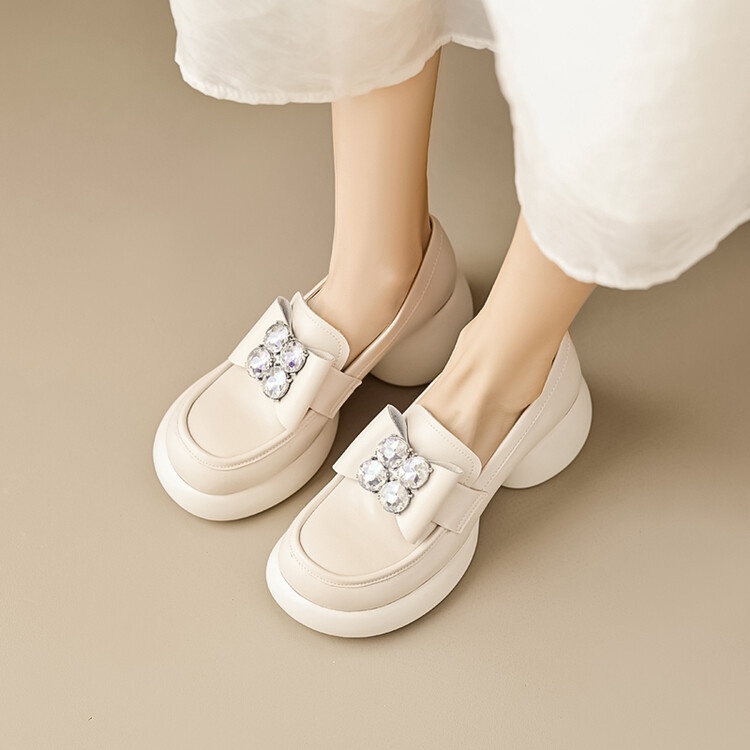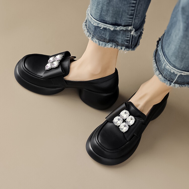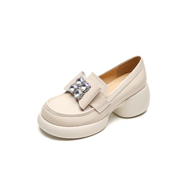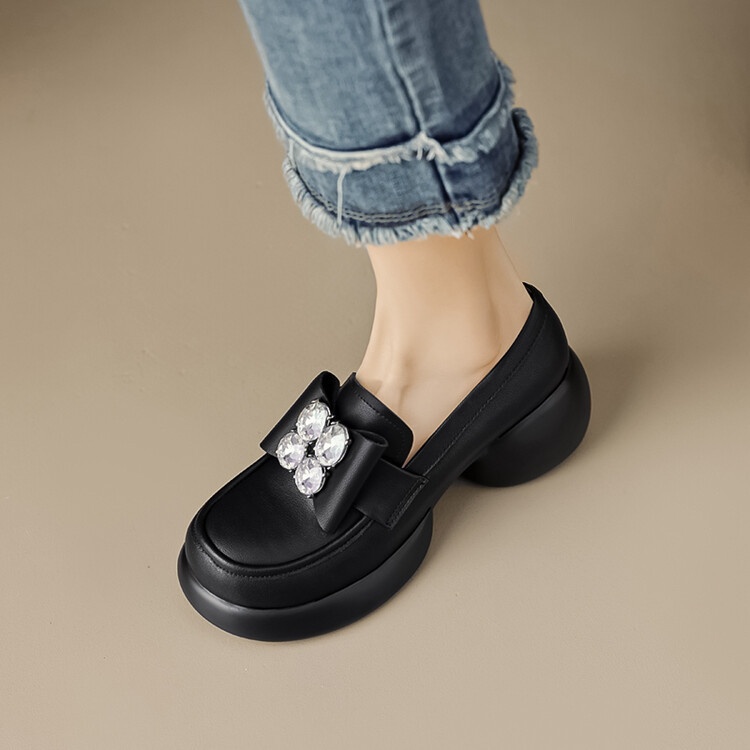 British Style Thick-soled Leather Shoes For Women Cowhide Platform Loafers Spring And Autumn Rhinestone High-heeled Thick-heeled Shoes
