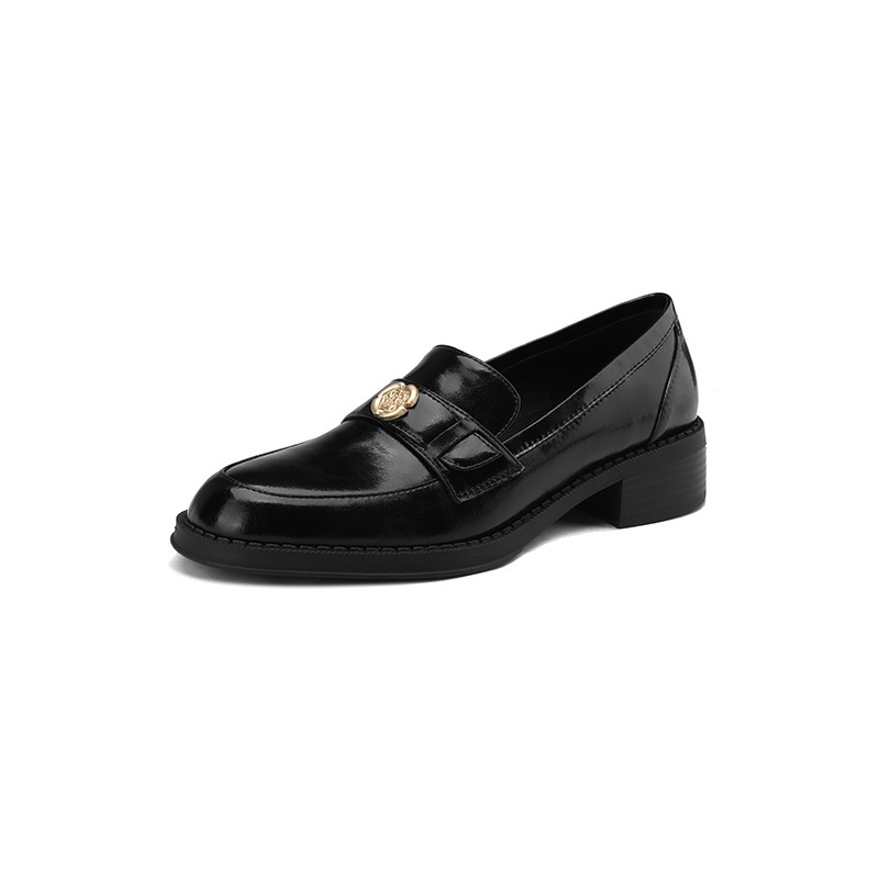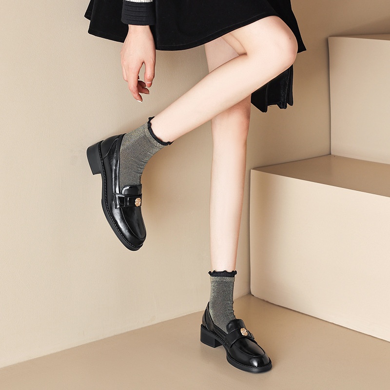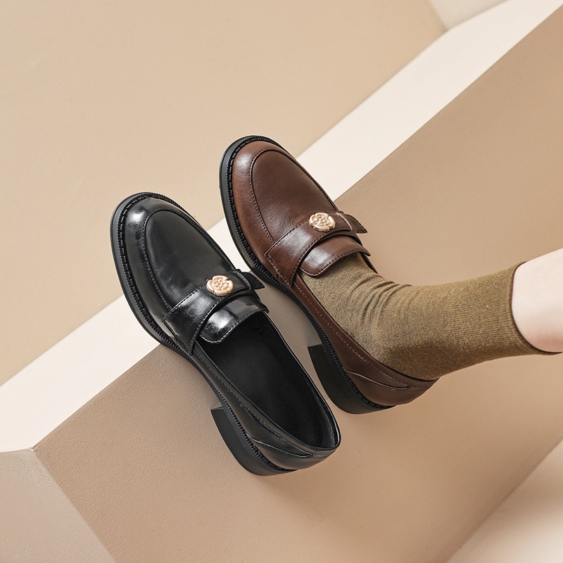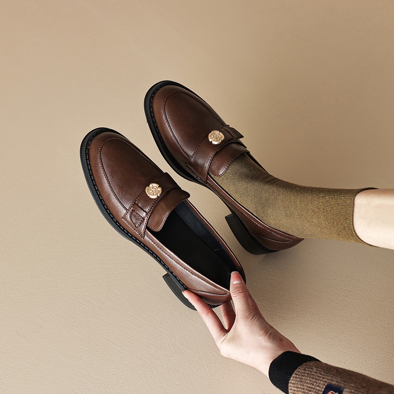 Autumn Round Toe Loafers Women's Mid-heel Shoes Thick Heel Single Shoes Retro Brown Leather Women's Shoes