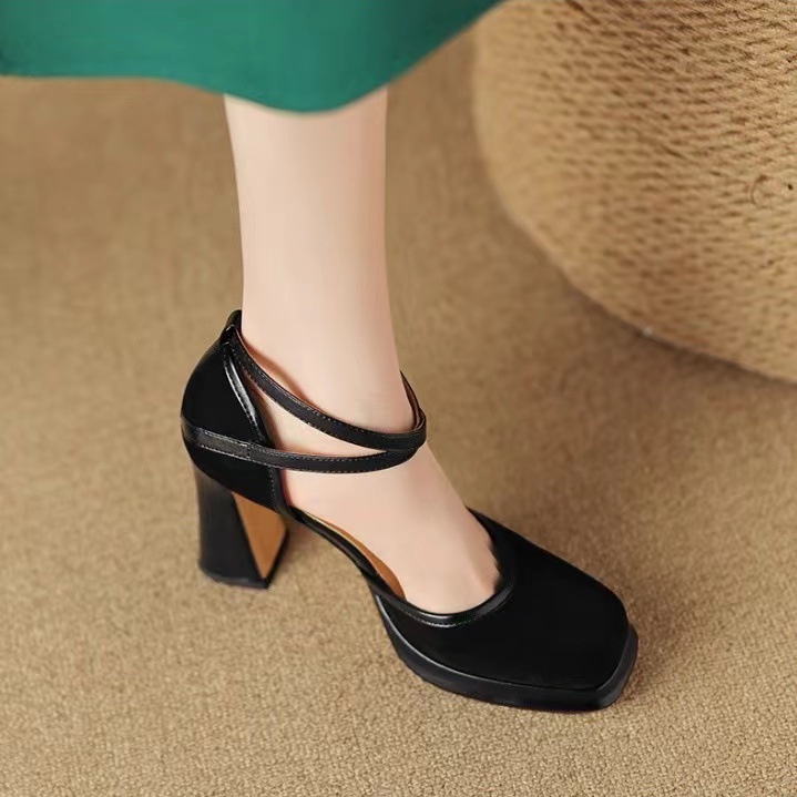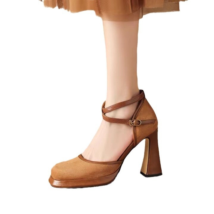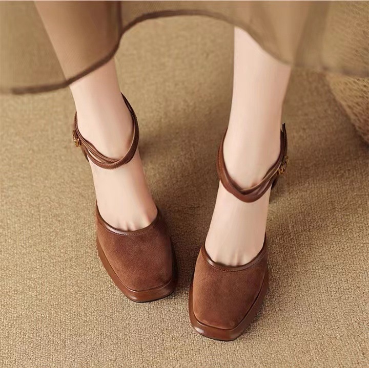 Fashionable Temperament Queen Fan Square Head Suede Thick Heel Ankle Strap Single Shoes Temperament High Heels