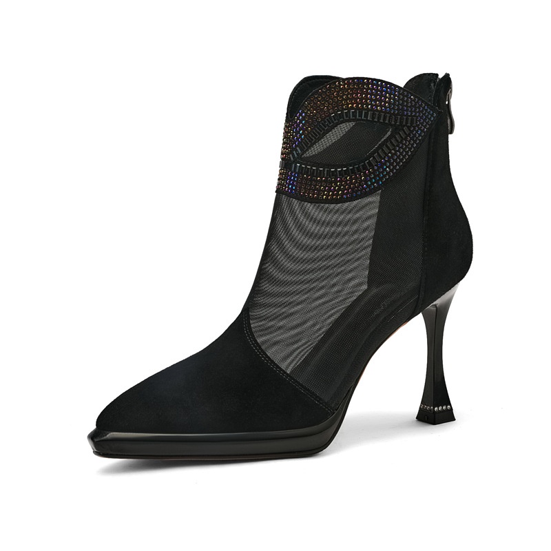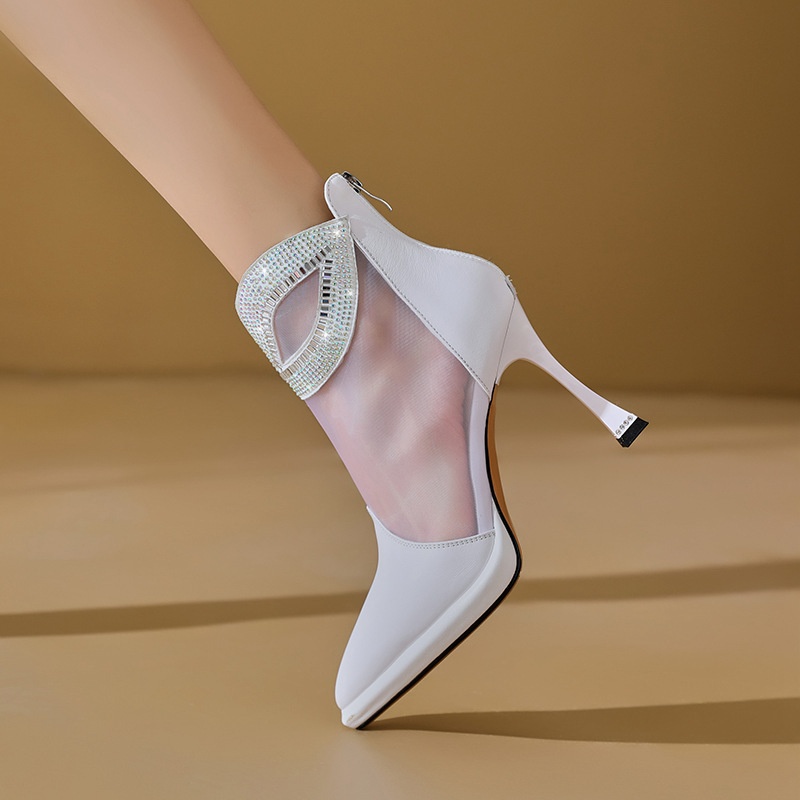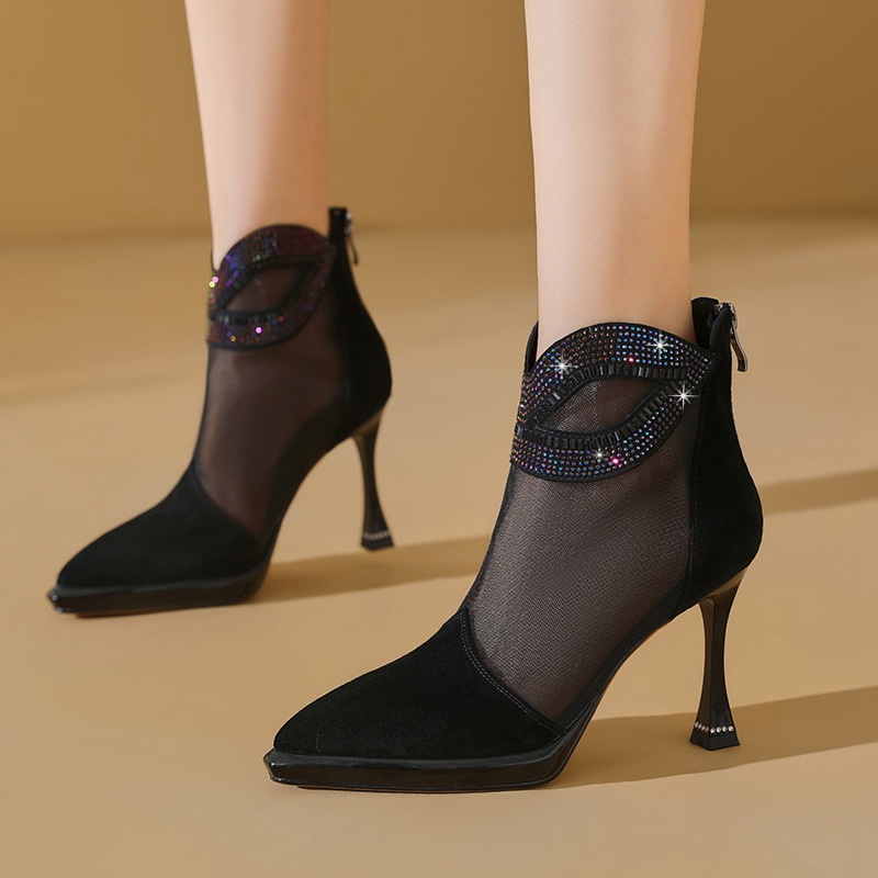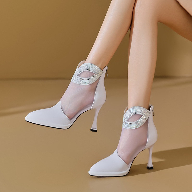 Cowhide Stitching Mesh High Heel Boots Hollow Sandals Spring And Summer Women's Shoes Diamond Stiletto Heel Zipper Mesh Boots