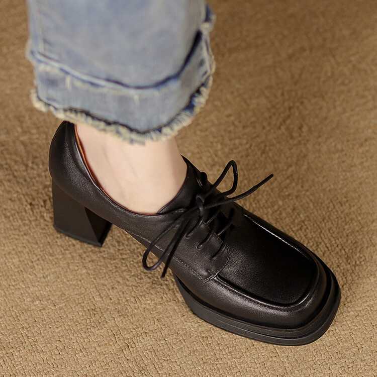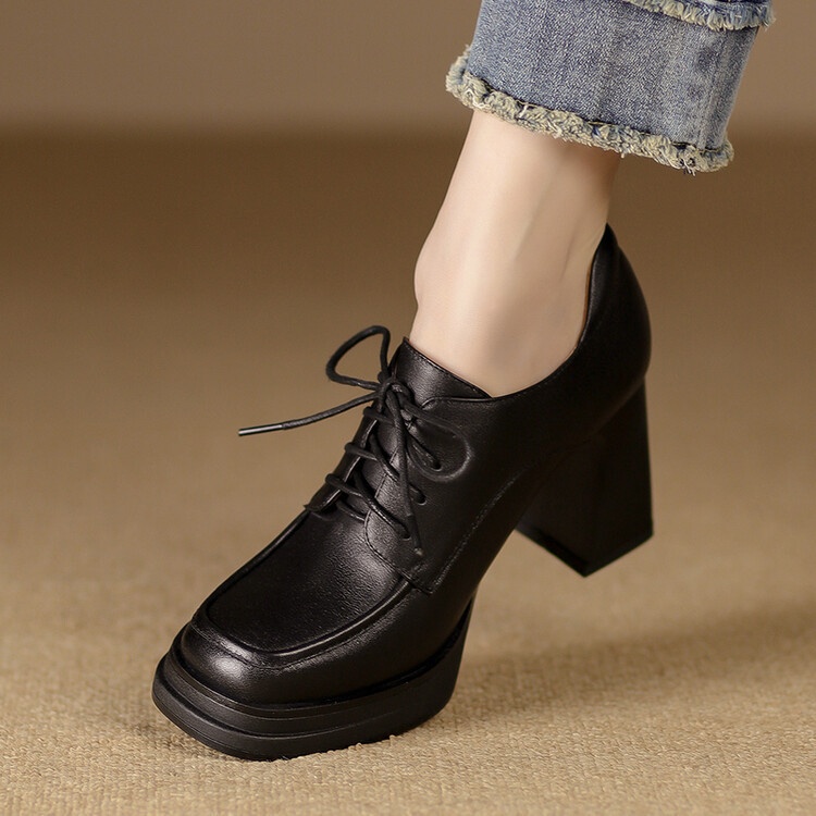 Retro Thick Heel Single Shoes For Women Cowhide Lace-up British Style Small Leather Shoes Autumn Waterproof Platform High Heels