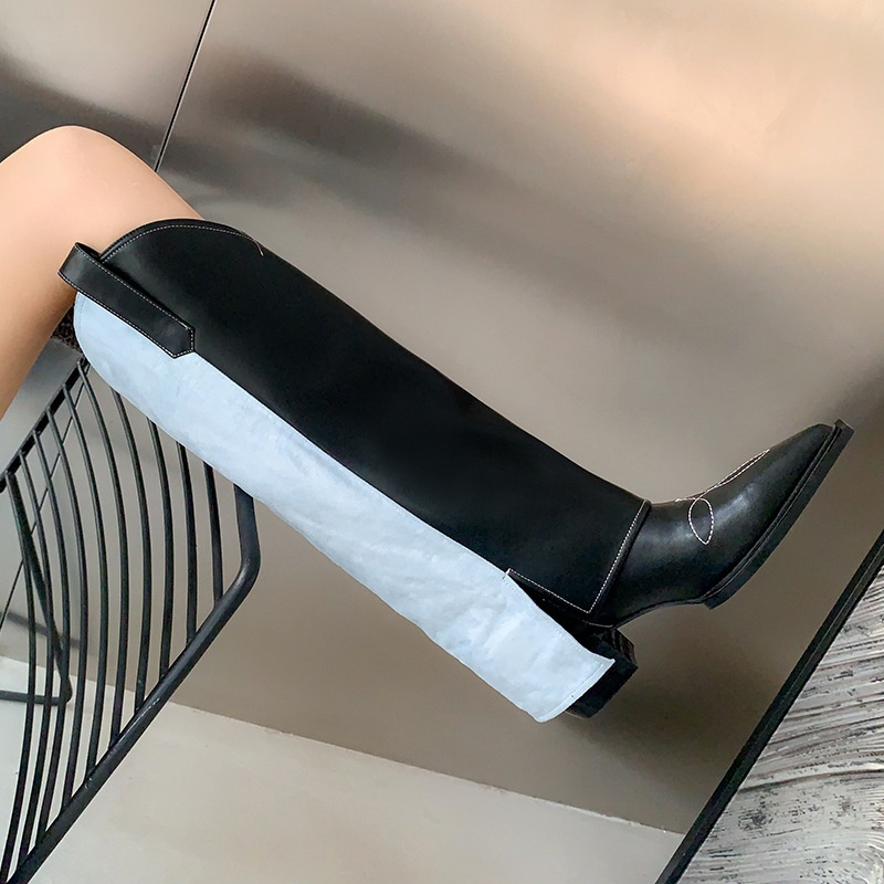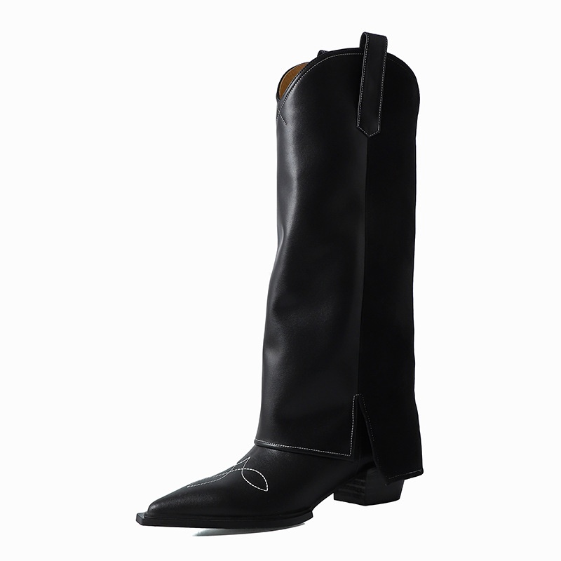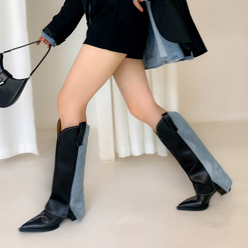 Color Matching Thick Heel Large Tube Trouser Boots Knight Boots Long Boots Pointed Turn-up Embroidery Women's Boots Large Size
