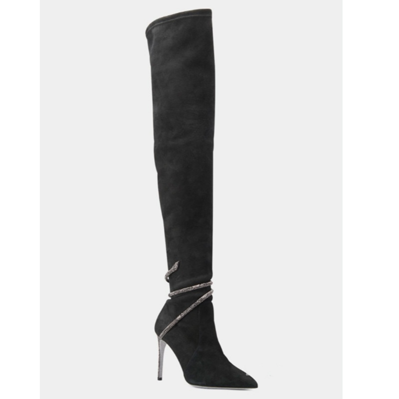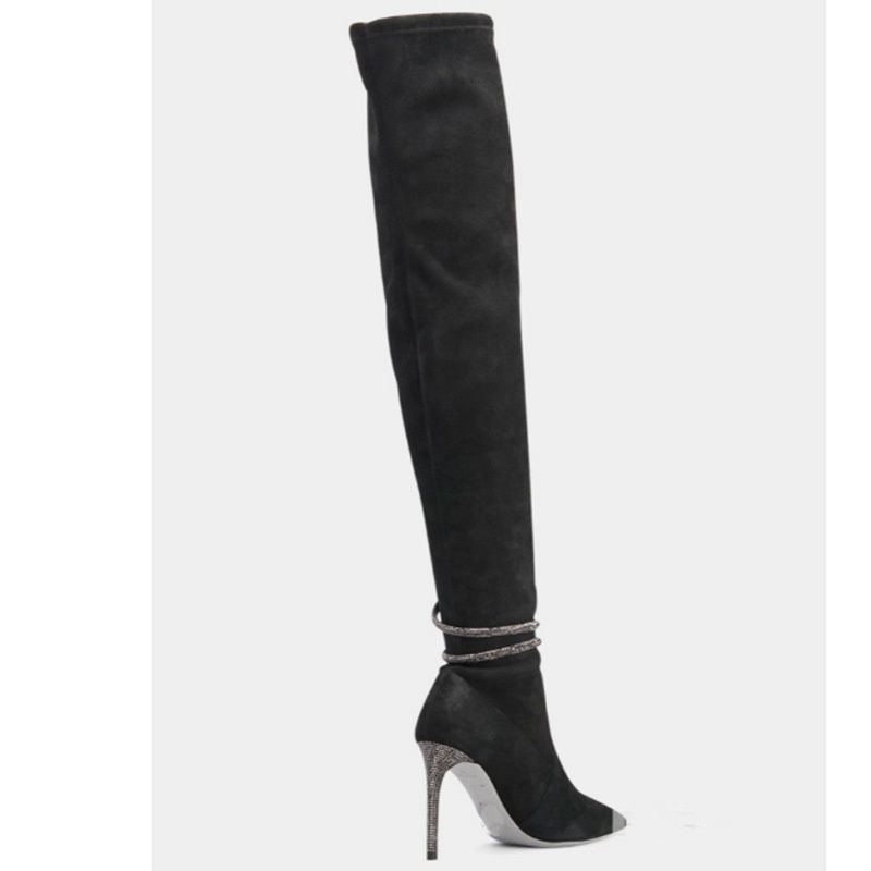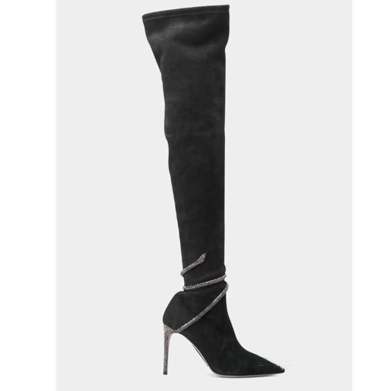 Winter Foreign Trade Style Pointed Stilettos Ultra-high Heels Snake-shaped Circle Rhinestone Elastic Large Size Over-the-knee Boots For Women