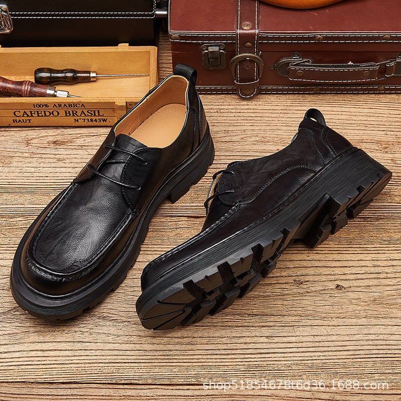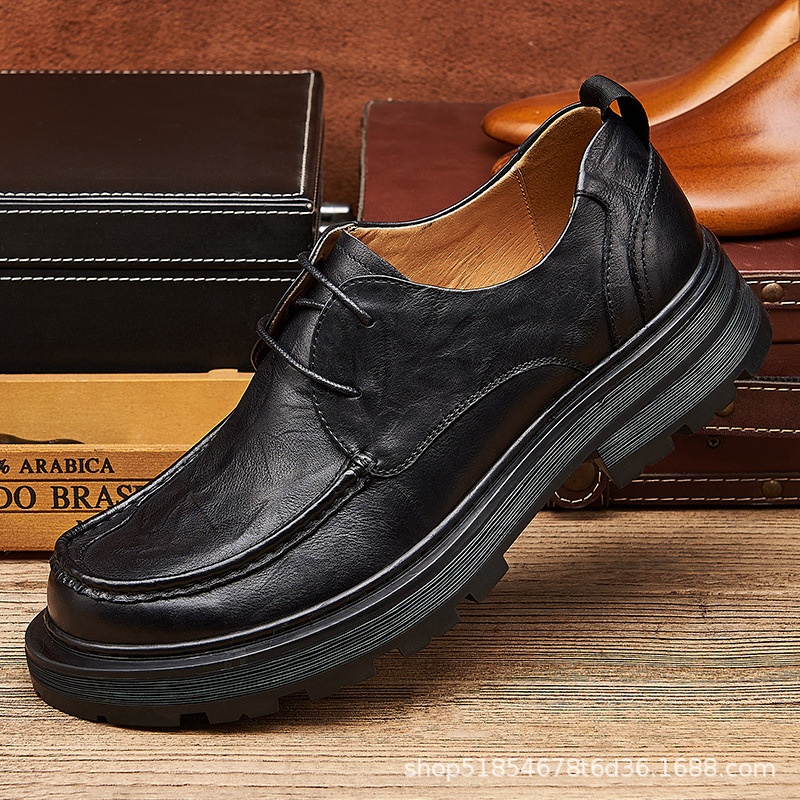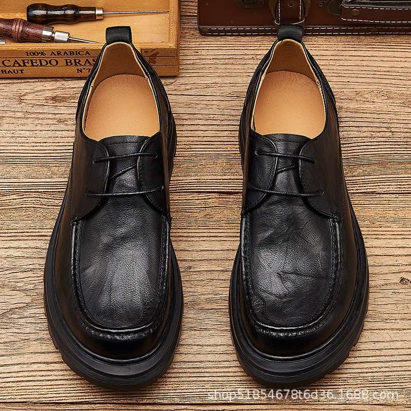 Spring Black Men's Shoes British Thick-soled Big-head Casual Leather Shoes Wide Version Simple Work Shoes Men