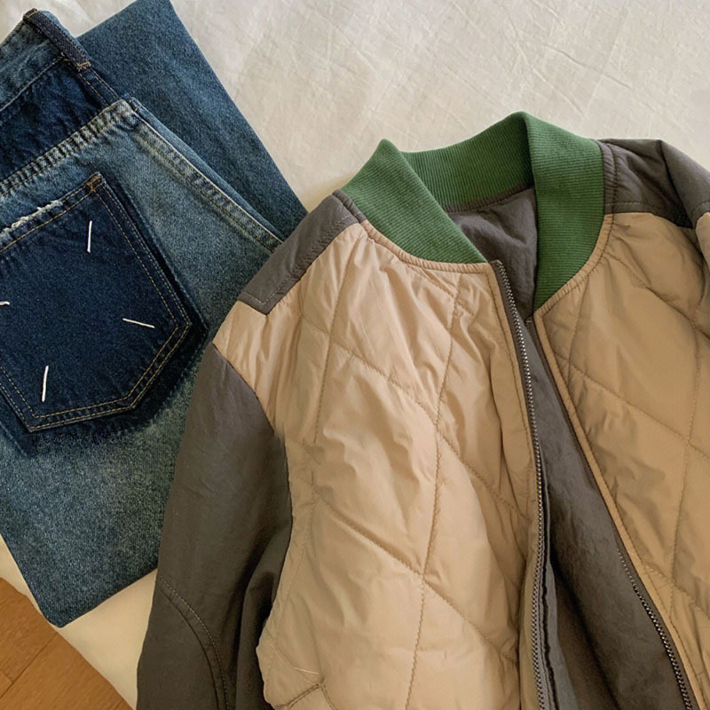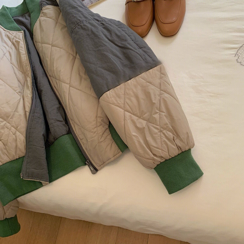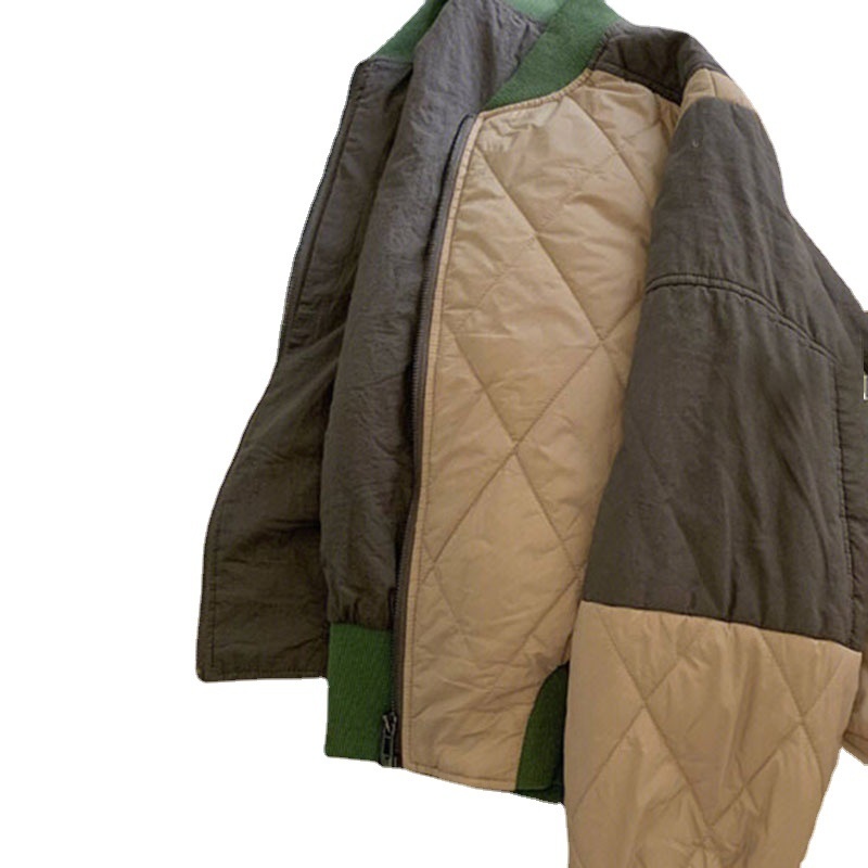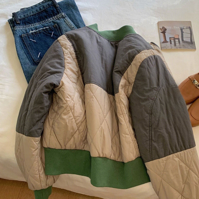 Hong Kong Style Retro Stitching Contrast Color Diamond Cotton Jacket Winter Small Short Cotton Baseball Jacket