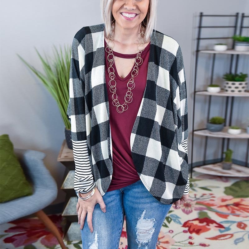European And American Foreign Trade Autumn And Winter Contrast Color Houndstooth Top Striped Sleeve Cardigan Windbreaker Jacket Women