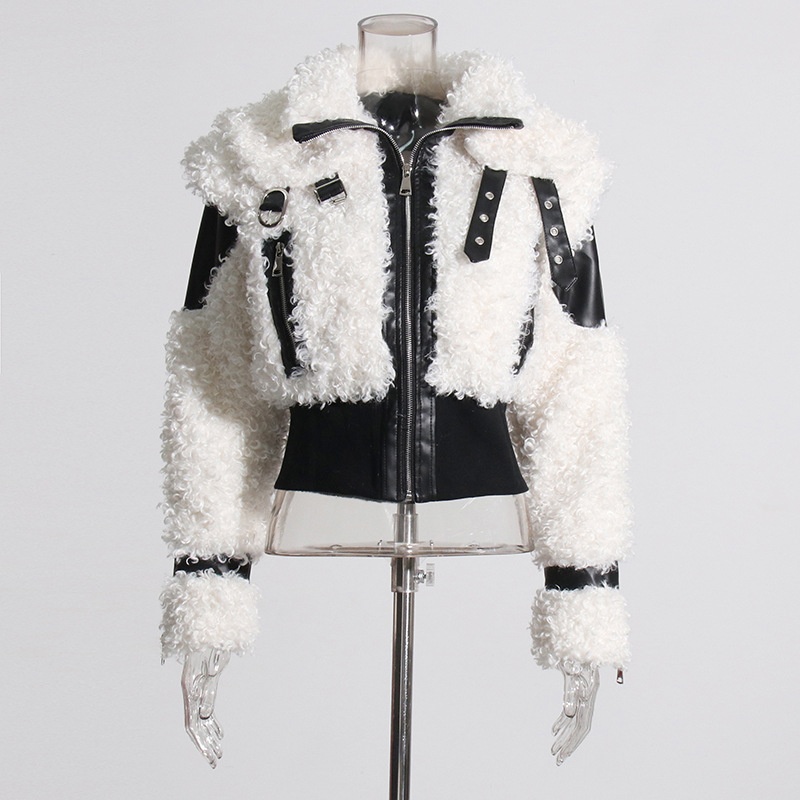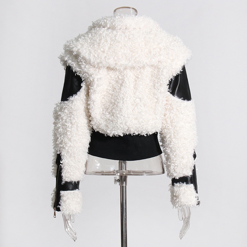 Fashion Motorcycle Style Jacket Design Sense Leather Stitching Thickened Short Waist Lambswool Jacket For Women