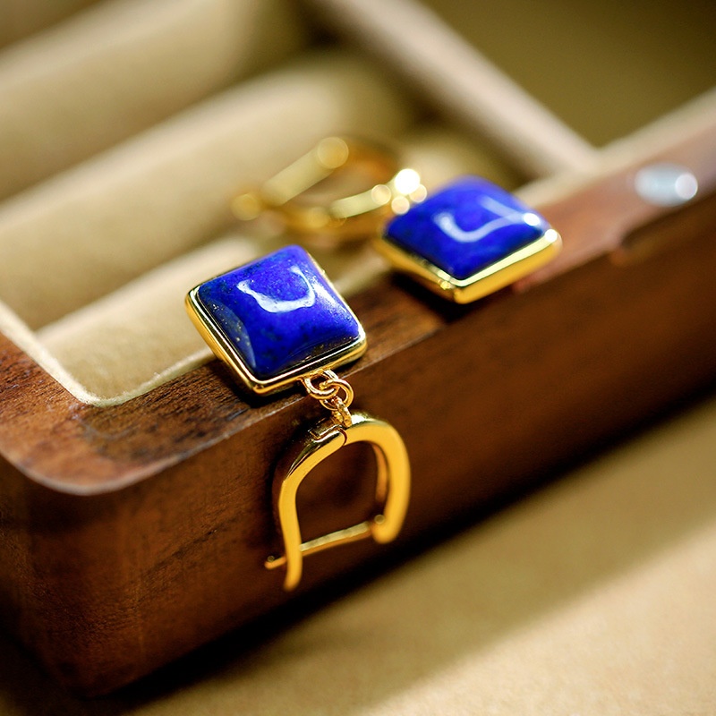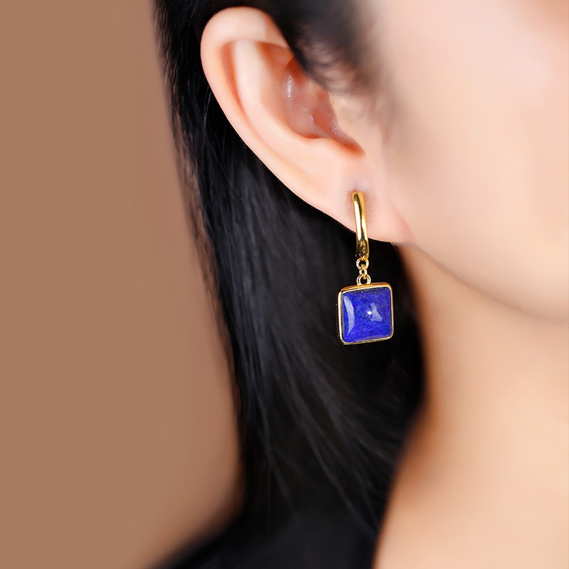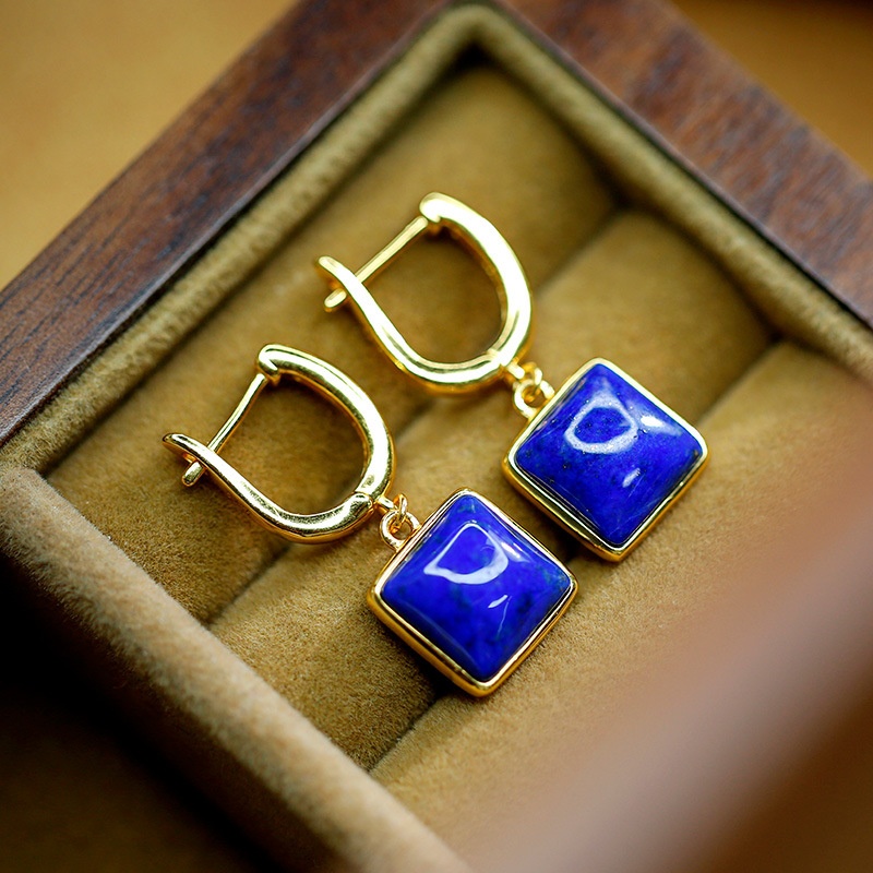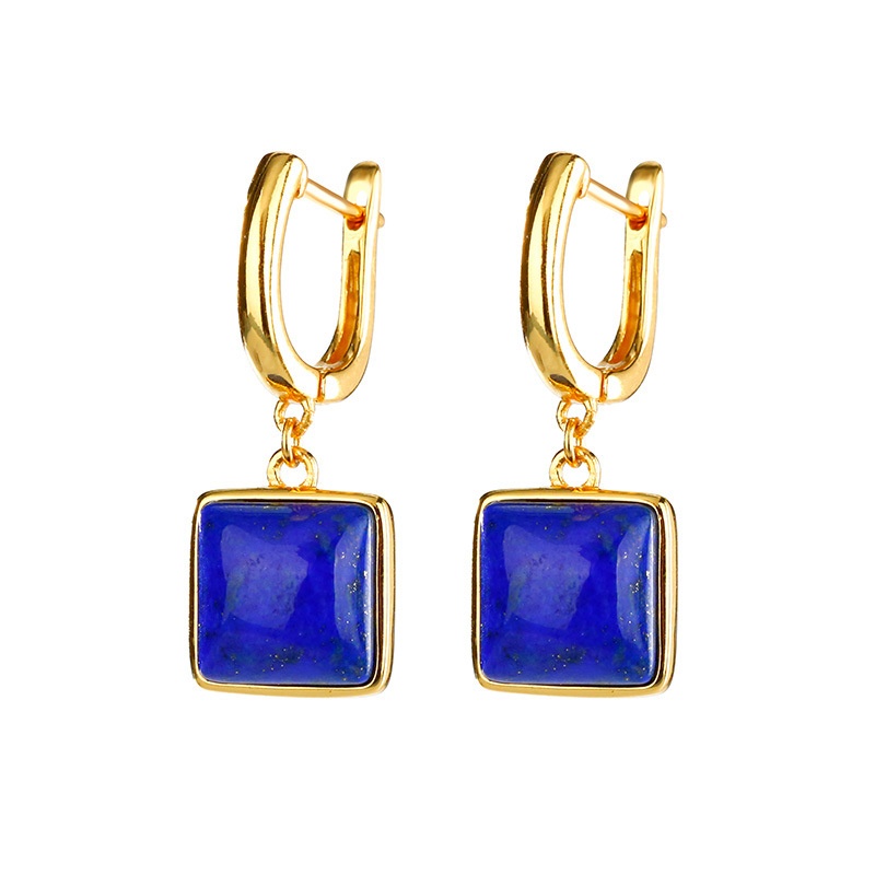 Huibaoli S925 Silver Gold-plated Inlaid Lapis Lazuli Cube Geometric Earrings For Women,Simple And Versatile Temperament Earrings