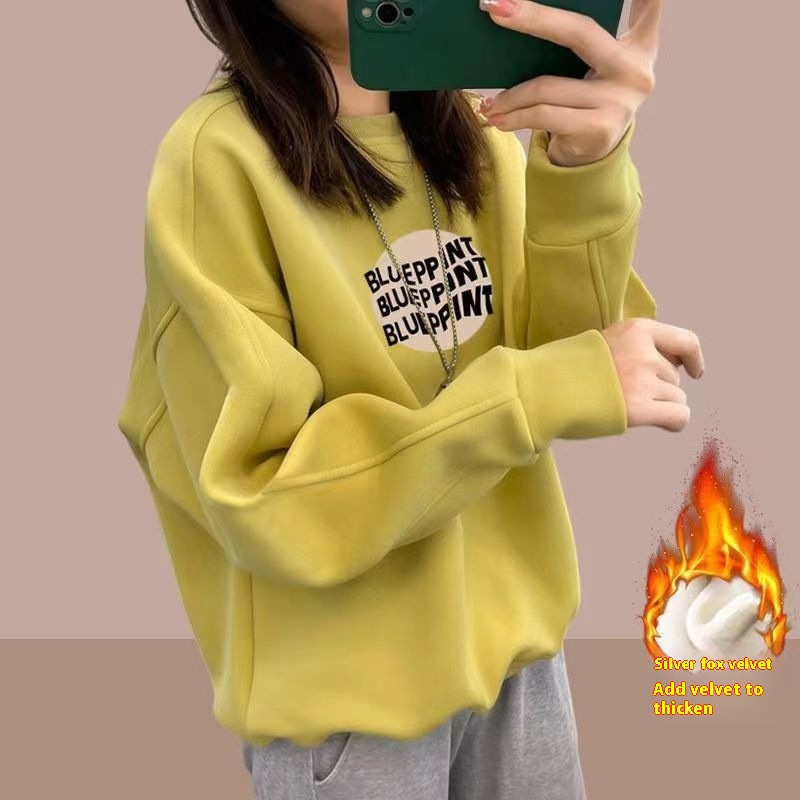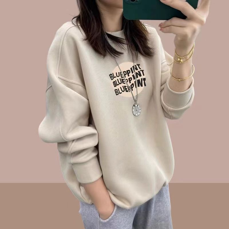 Cotton Round Neck Sweatshirt For Women In Spring With Plush And Thickened Loose Casual Pullover Lazy Style