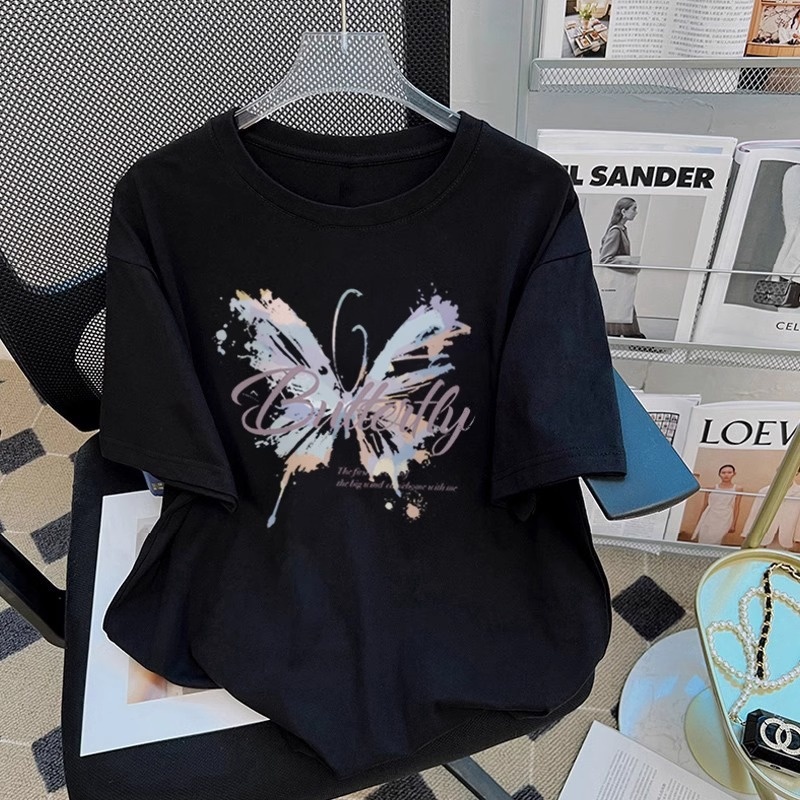 Cotton Short-sleeved T-shirt Women's Summer Arrival Loose Round Neck All-match Printed Shoulder Half-sleeved T-shirt Top