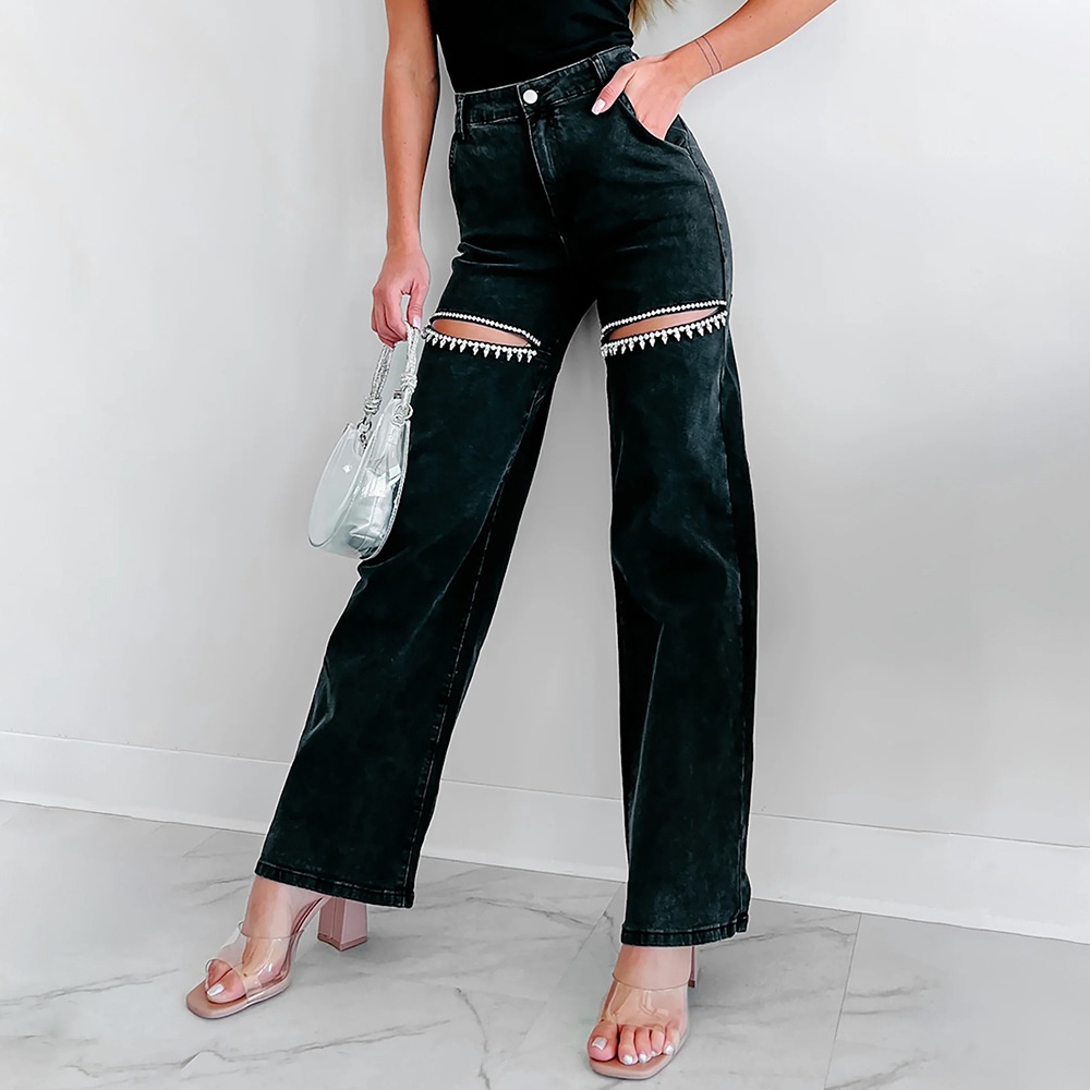 Autumn Europe And The United States Fashion Casual Nail Drill Hole Straight Tube Ladies Do Old Jeans