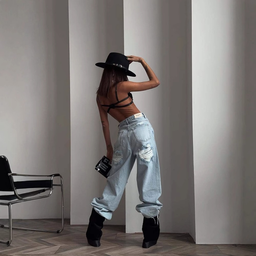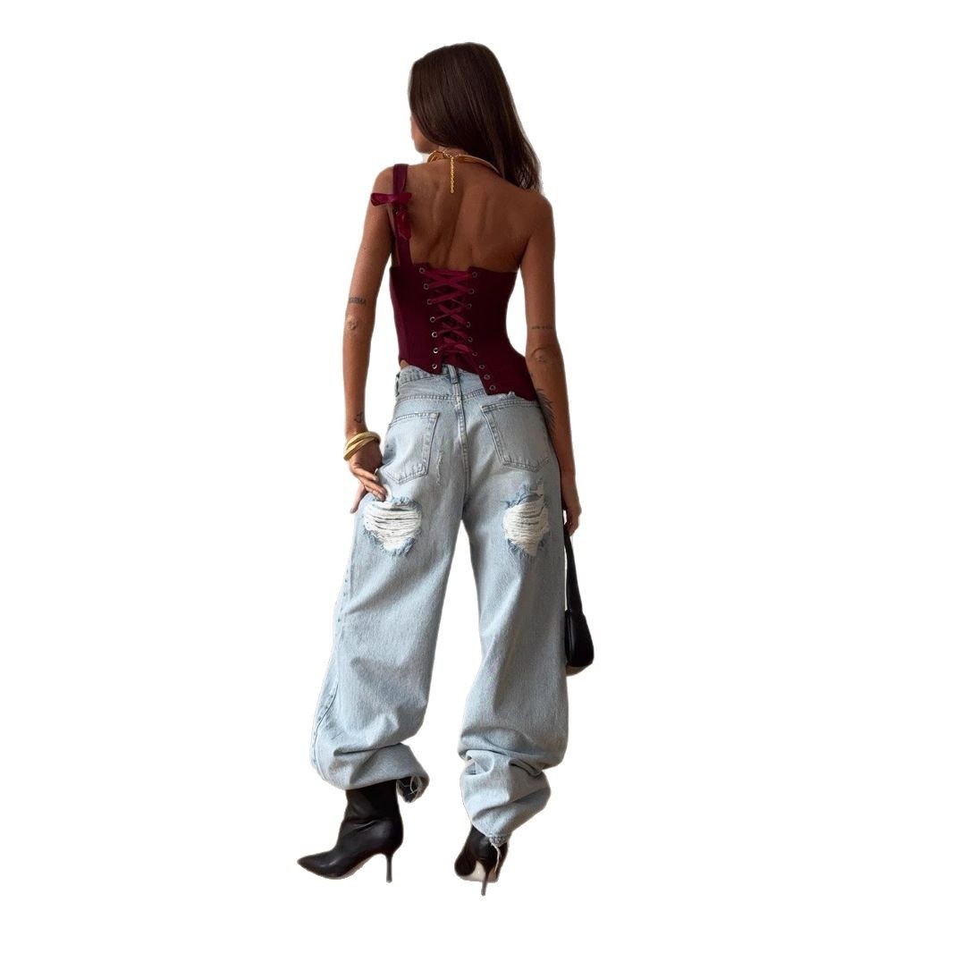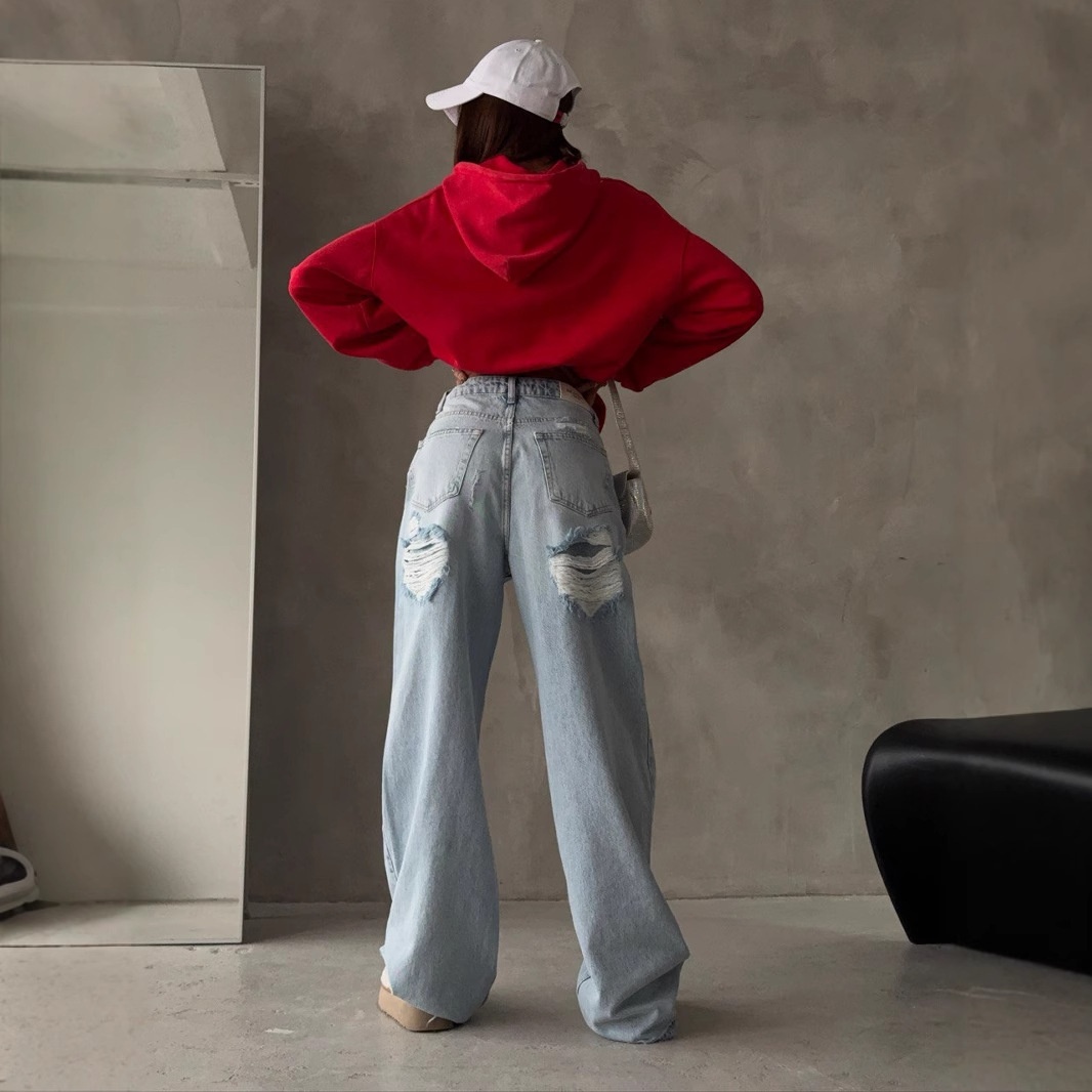 Hot Girl Style All-match Ripped Jeans Women's Spring And Summer Retro Light Blue Straight Leg Pants Women's