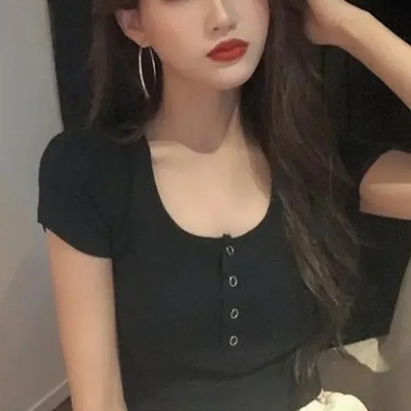 Summer Slimming Cropped Round Neck High-waisted T-shirt Women's Base Layer Short Sleeves Tops