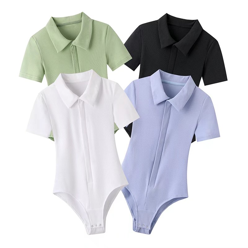 European And American Style Equestrian Polo Shirt Women's Summer Short-sleeved Lapel One-piece Shirt Front Zipper Slim-fit Top Crotch T-shirt