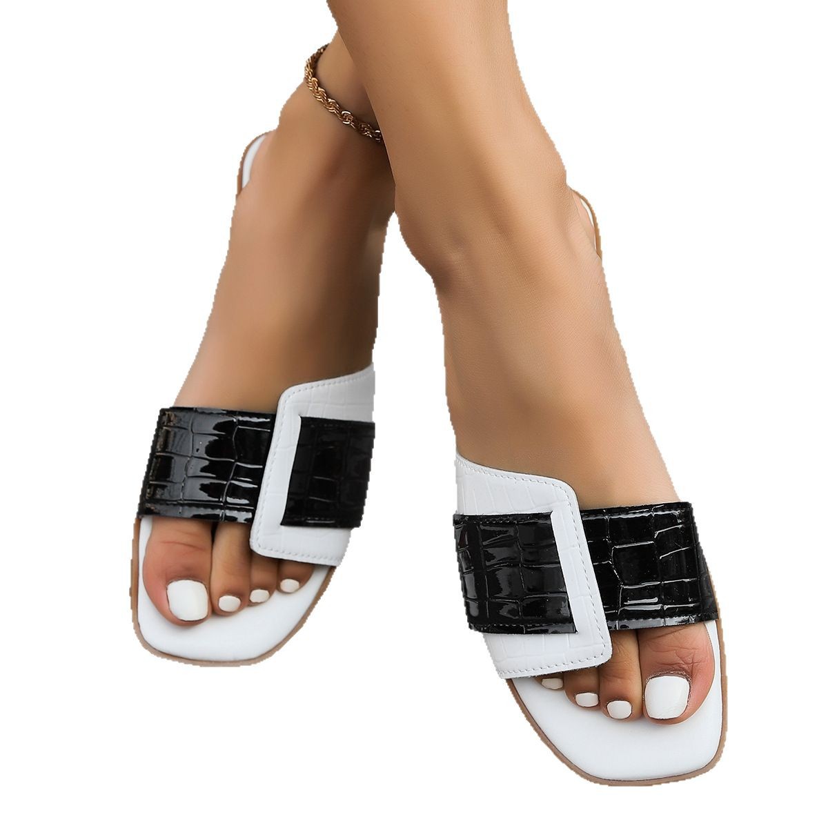 拖鞋女大码方头平底简约拼色休闲一字外穿凉拖鞋
