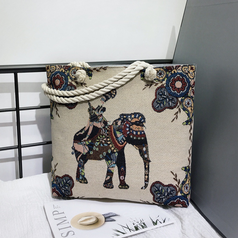 Thai Style Thick Rope Shoulder Women's Bag Double-sided Linen Bag Ethnic Style Elephant Tote Bag Embroidered Big Bag