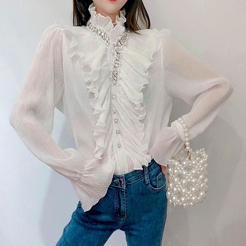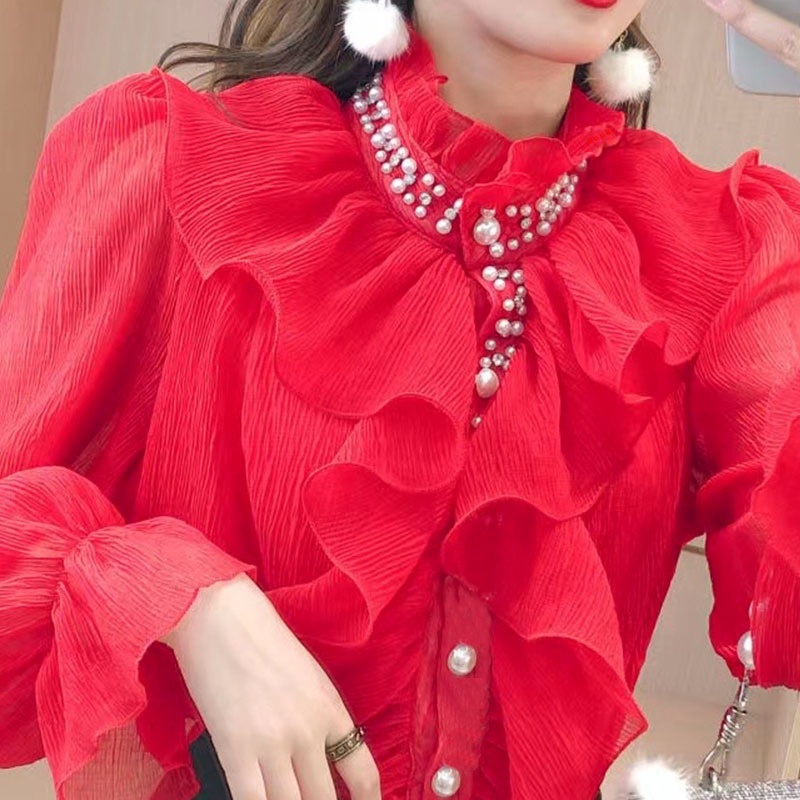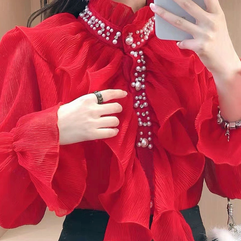 Shirt Women's Autumn Korean Version Of Sweet Heavy Industry Nail Beads Rhinestone Ruffled Foreign Style Shirt Tide D
