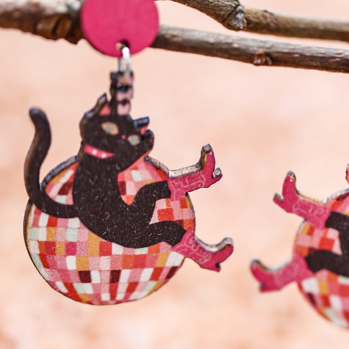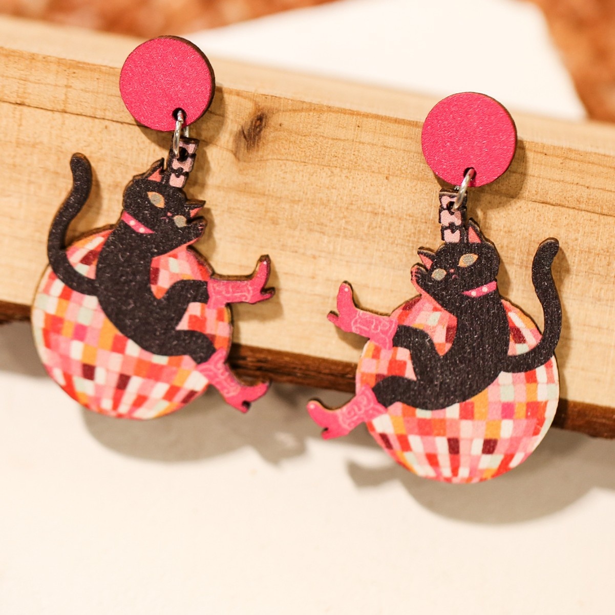 Cartoon Fun Cat Dancing On Disco Ball Wooden Women Earrings Fashion Accessories Gift