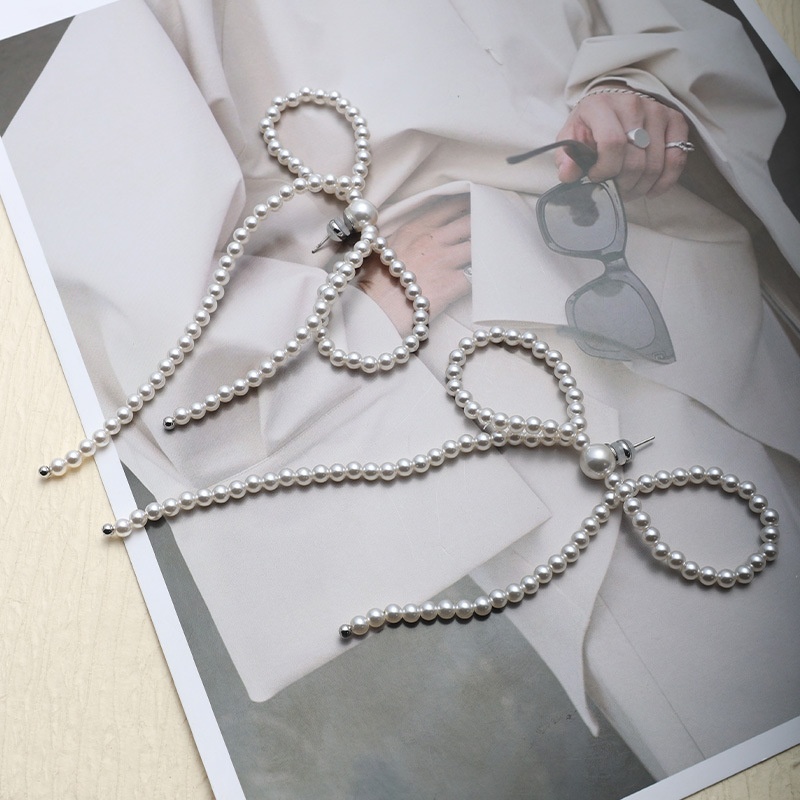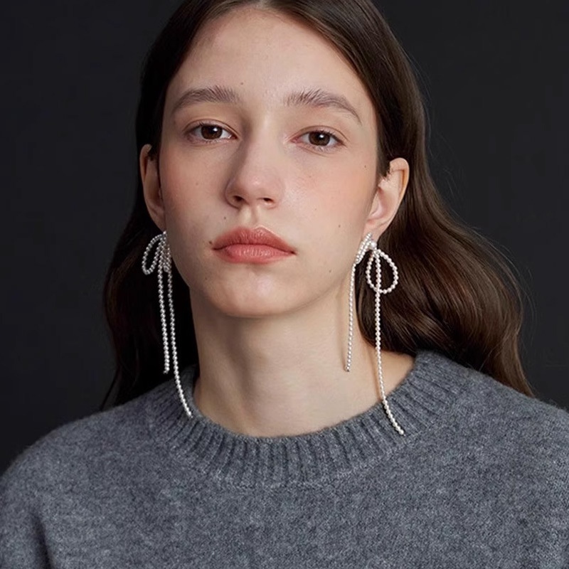 Niche Design Pearl Bow Long Tassel Earrings Women's Temperament All-match High-end Silver Pin Earrings Ear Jewelry