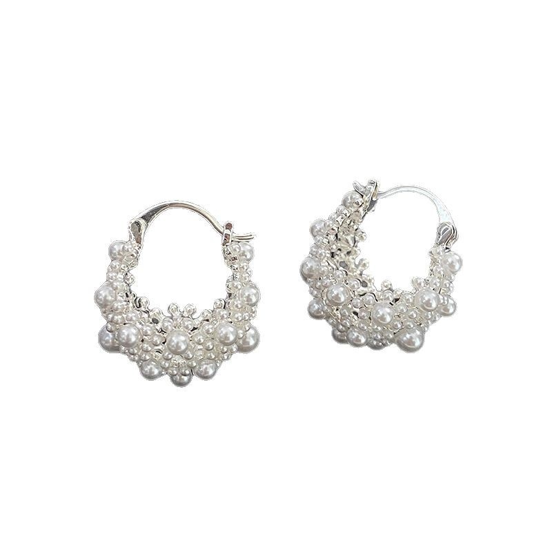 Thick Silver High-end Sense Small Rice Beads Basket Ear Buckle Niche All-match Elegant Light Luxury Hollow Earrings Explosive Earrings