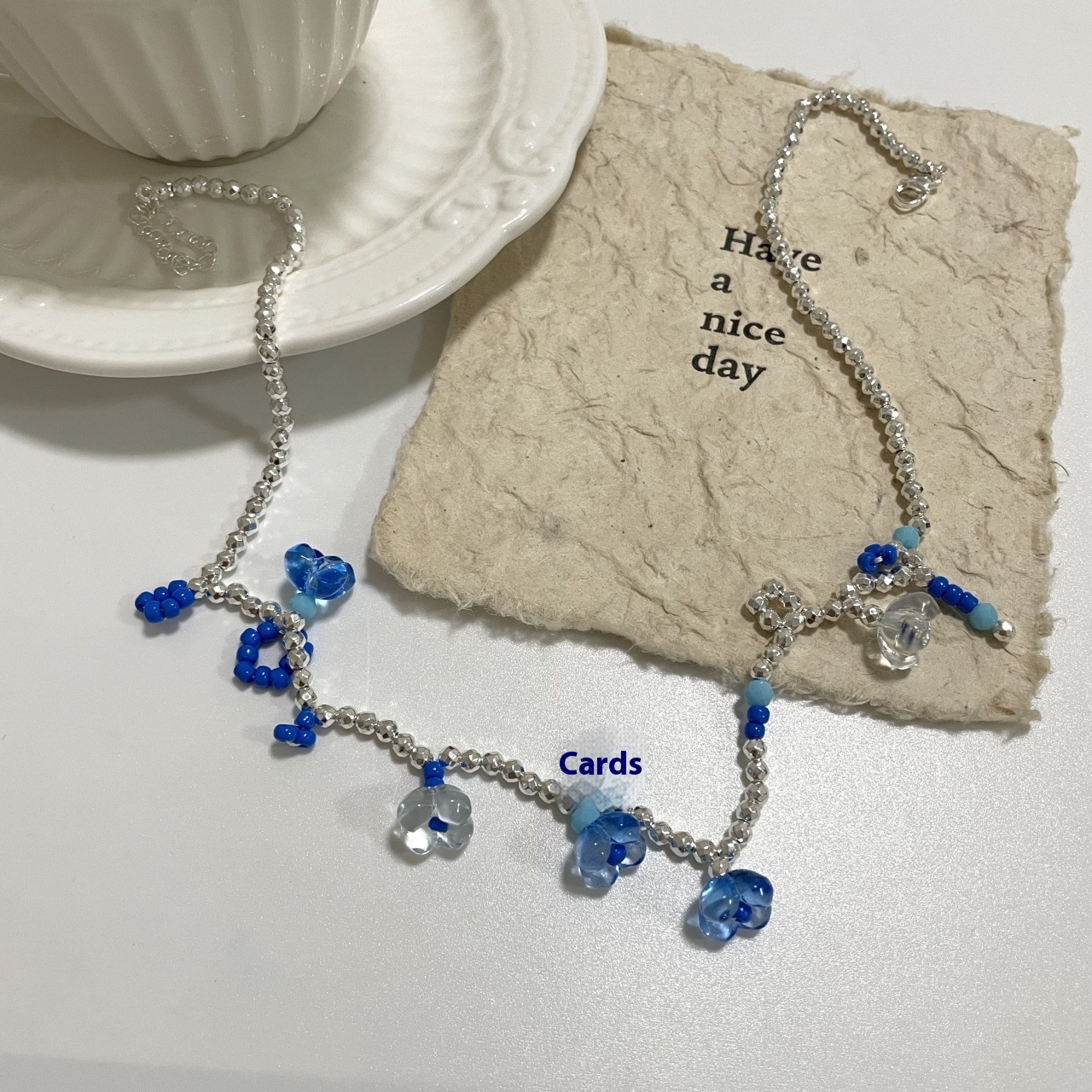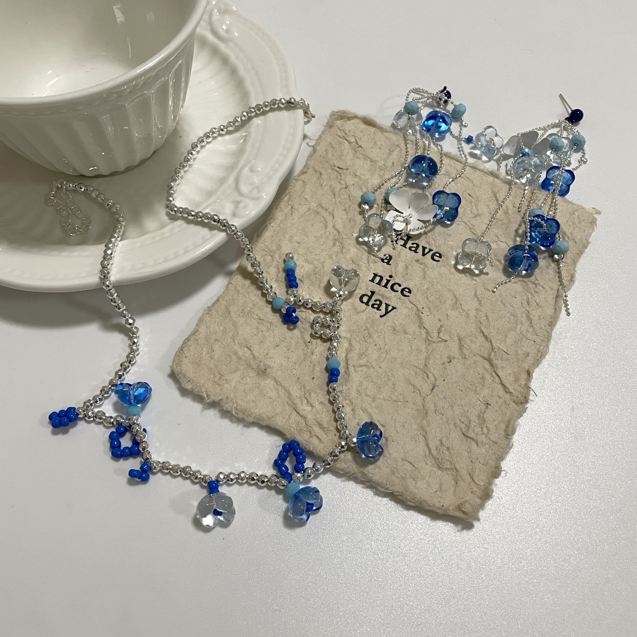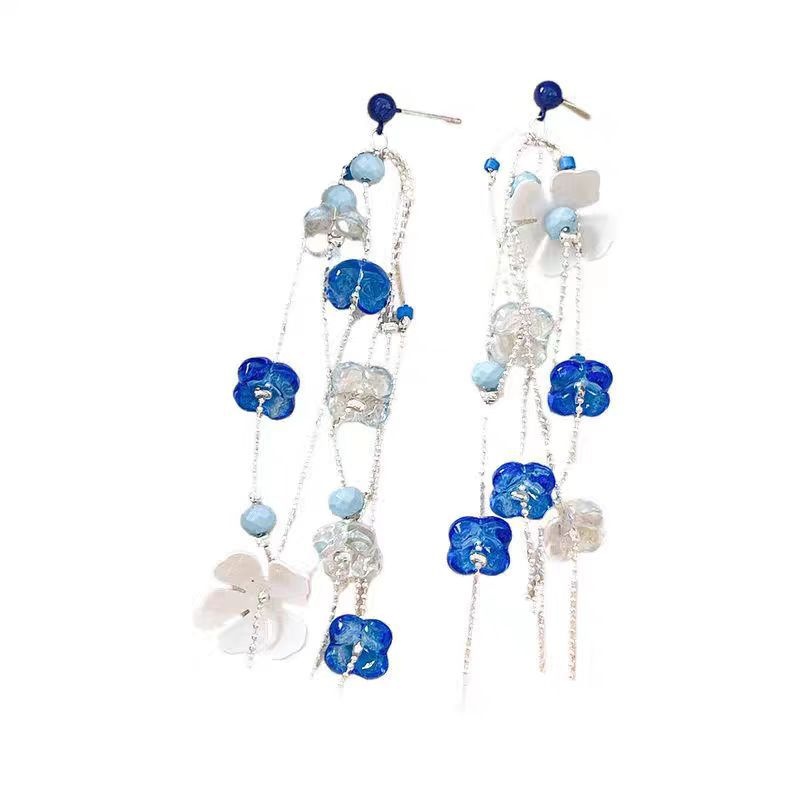 French Style Light Luxury Blue Flower Tassel Earrings Necklace Fashionable Elegant Lady High-end Small Fresh Style Jewelry Women