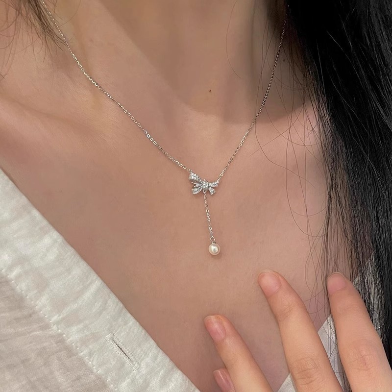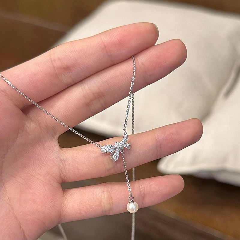 Light Luxury Elegant Bow Necklace Niche Fashion Design Imitation Pearl Tassel Pendant Collarbone Chain
