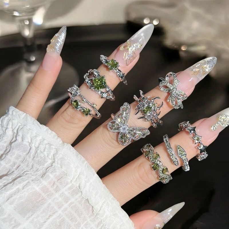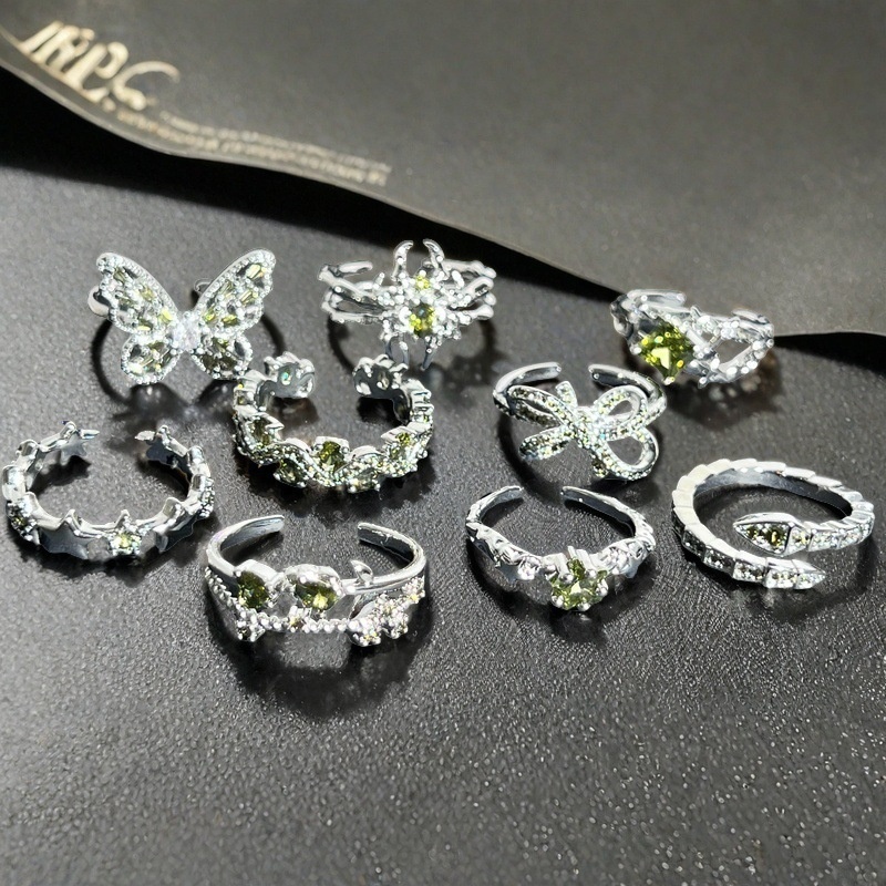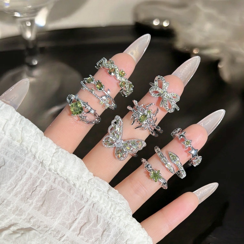 O Green Zircon Exquisite Color Treasure Opening Ring Women's Light Luxury Full Diamond Bow High-end All-match Ring