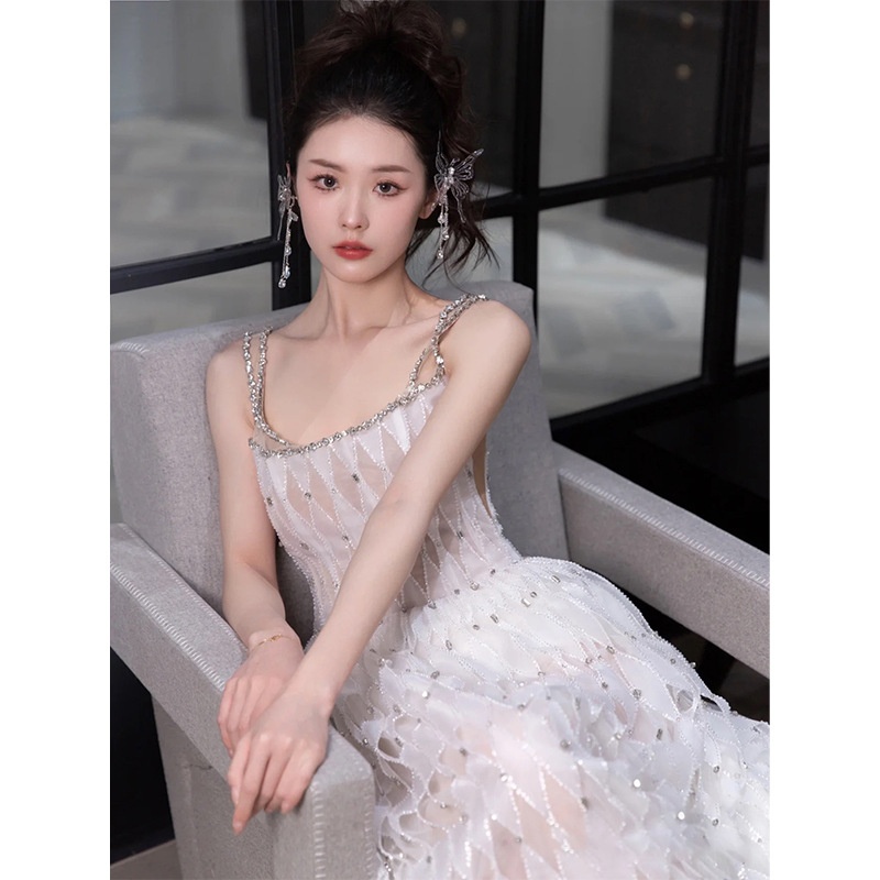 Light Wedding Dress Heavy Industry Sling High-end Sense French Super Fairy Morning Robe Gown With Sequin Star Banquet Dress