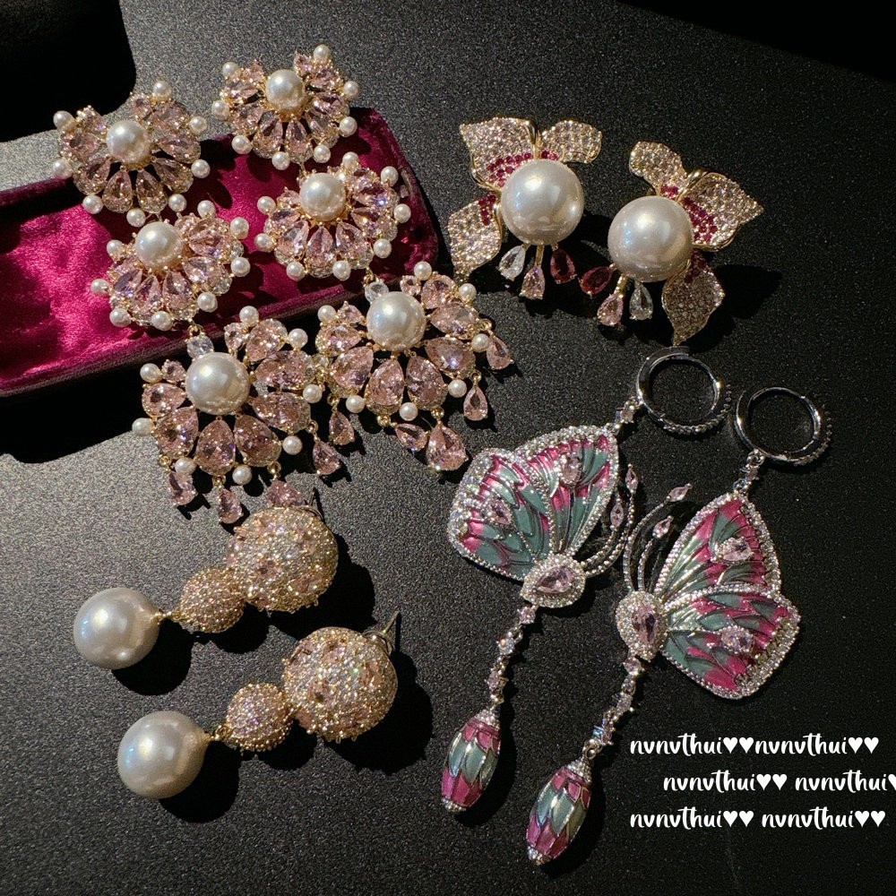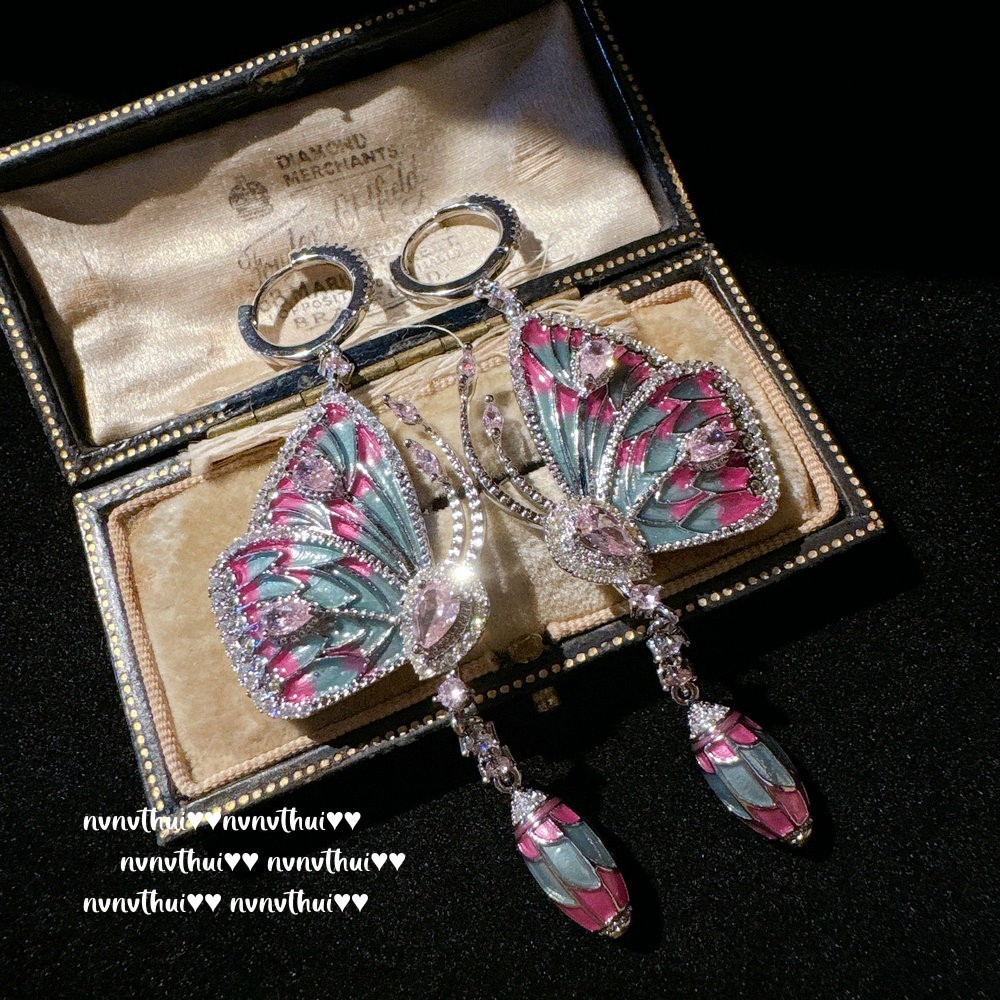 Imperial Concubine Powder Fan-shaped Gem Tassel Earrings Papalacha Plated 18K Gold Rainbow Drop Glaze Butterfly Zircon Earrings