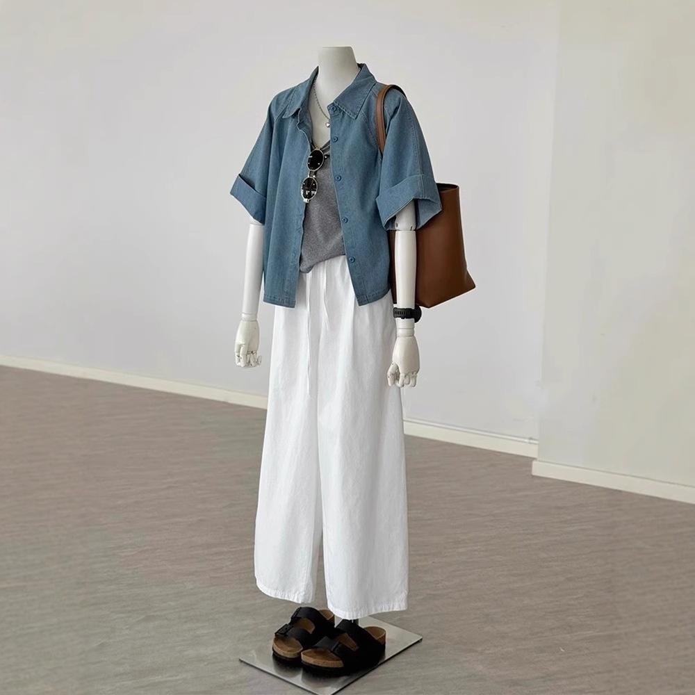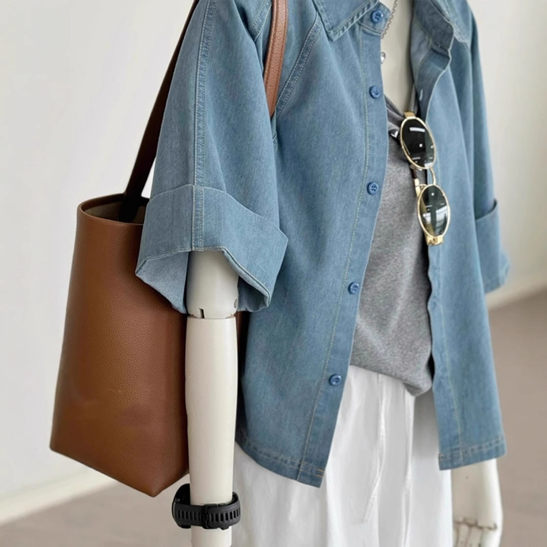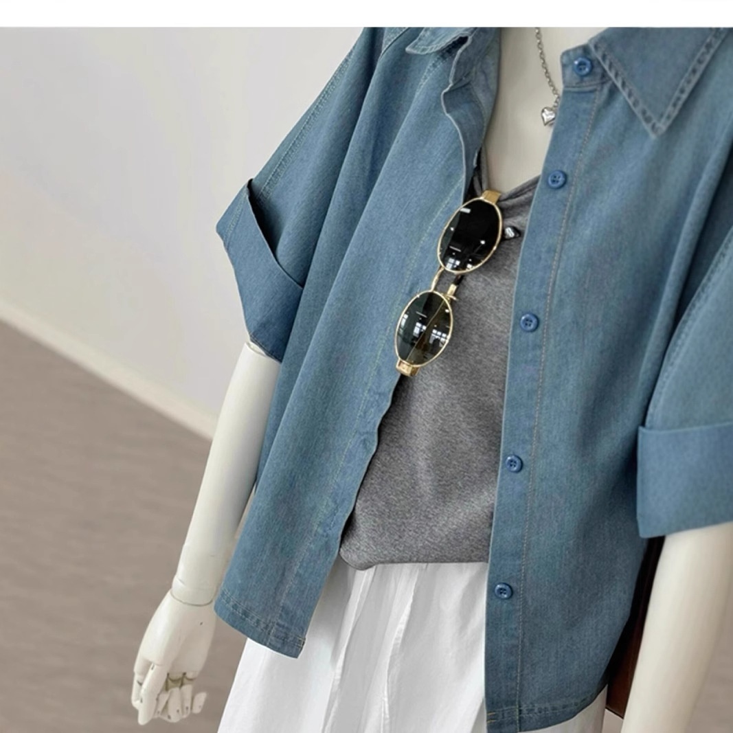 Hong Kong Style Chic Vintage Denim Blue Shirt Women's Summer Half Sleeve Loose All-match Casual Jacket