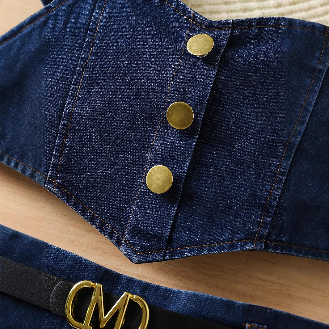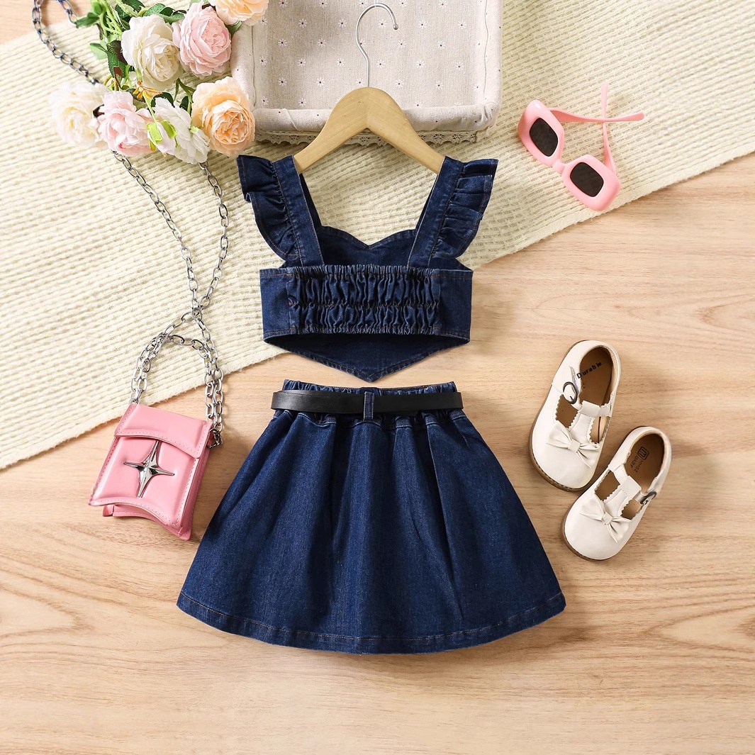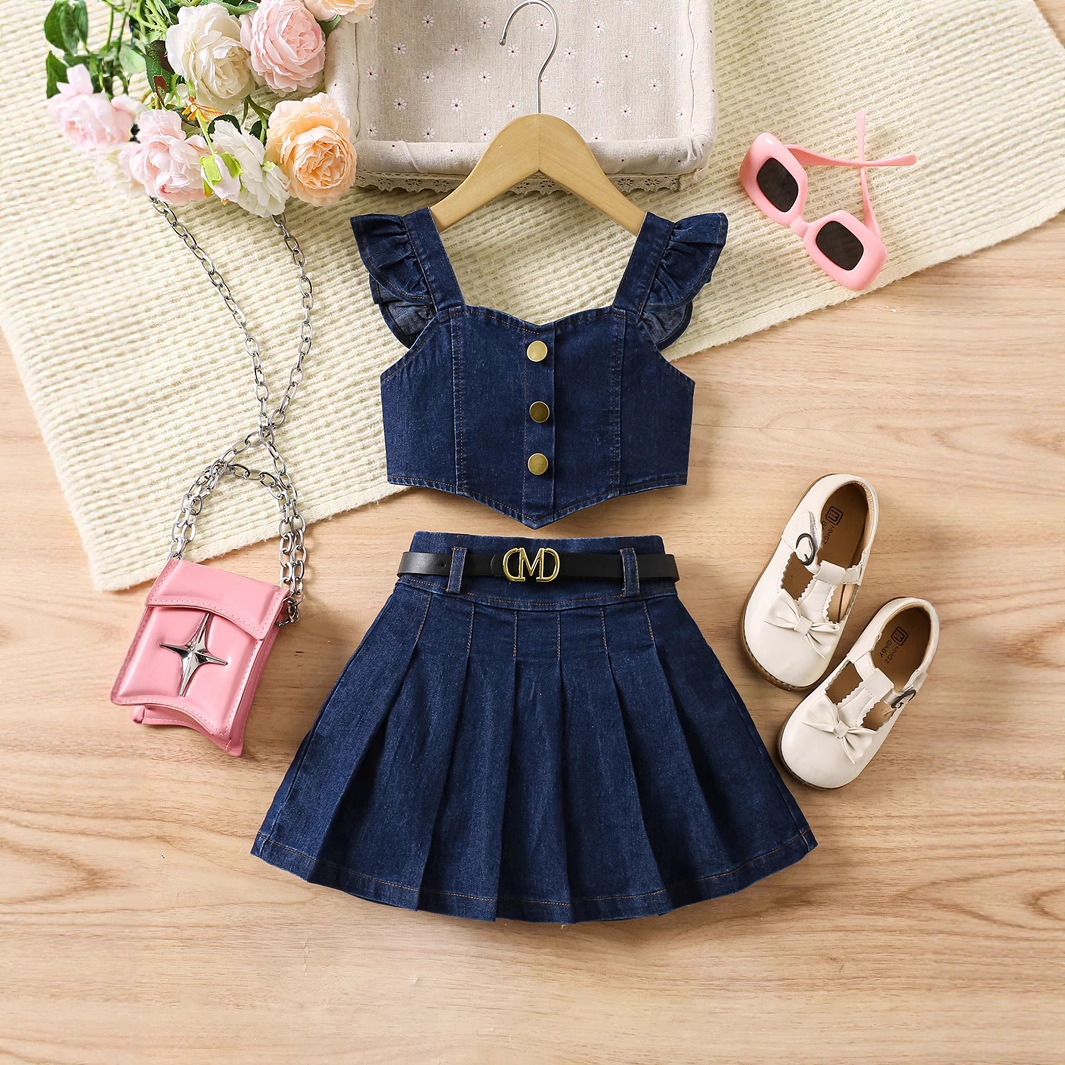 Summer Girls' Flutter Sleeve Decorative Button Irregular Hem Back Wrap Top With Elastic Pleated Skirt Denim 2-Piece Set