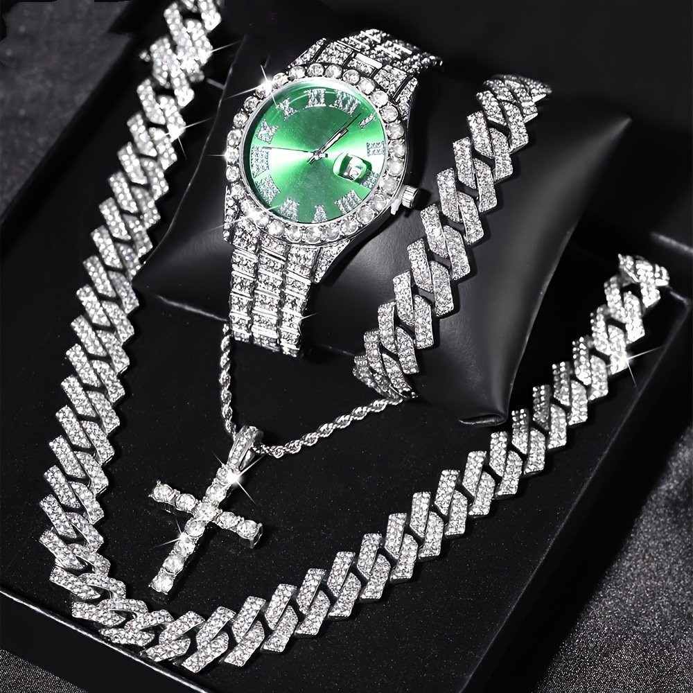 TEMU Explosive Diamond-encrusted Luxury Steel Band Quartz Watch Diamond-encrusted Hip-hop Cuban Bracelet With Suit Watch