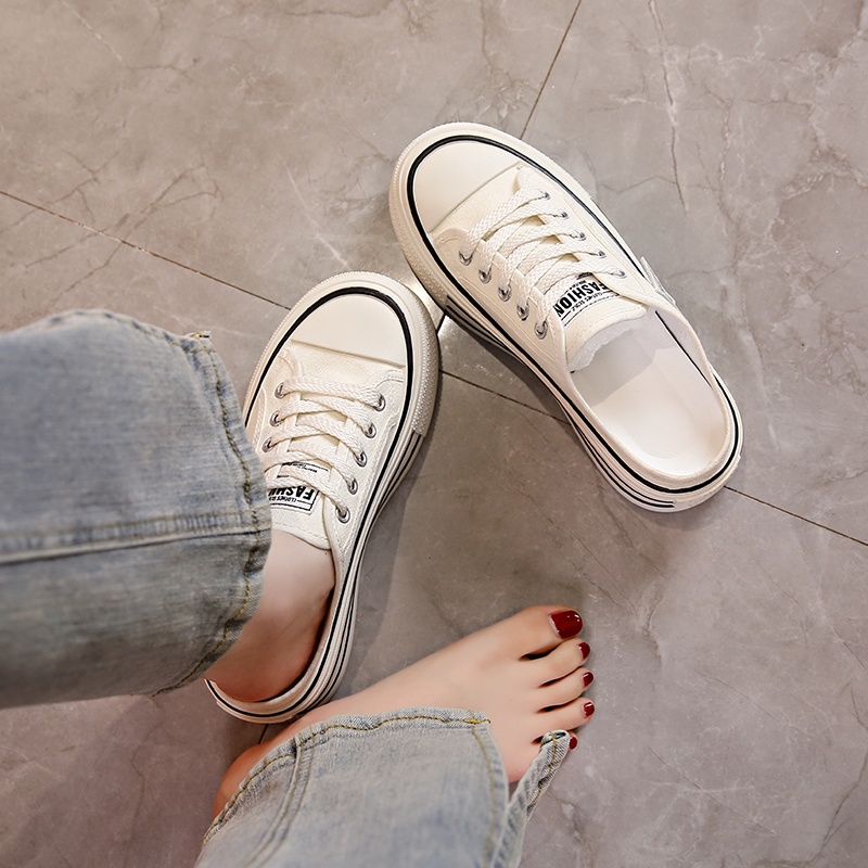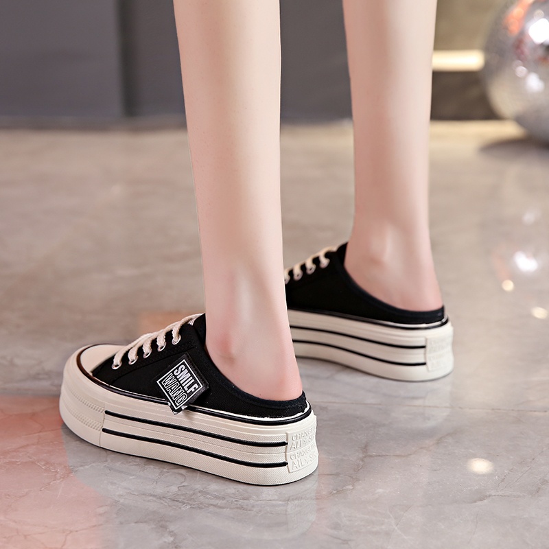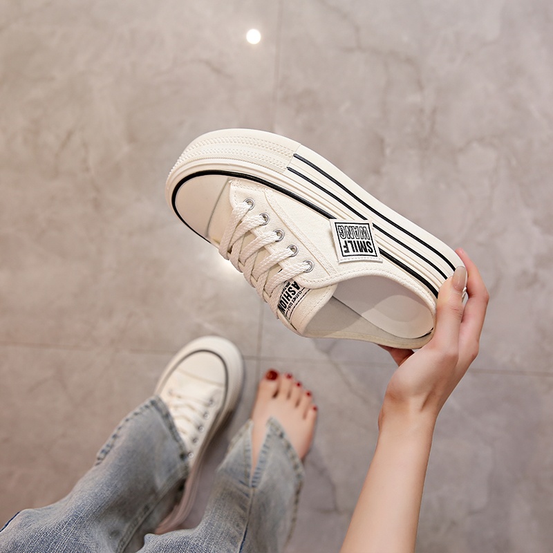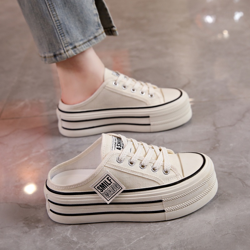 Canvas Half Slippers Women's Spring Outer Wear Internet Celebrity Hot High-grade Thick Bottom Increased Heel-free Lazy Man